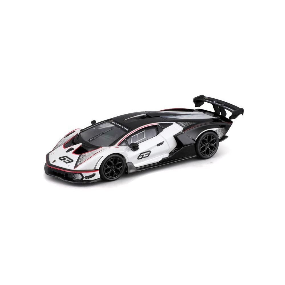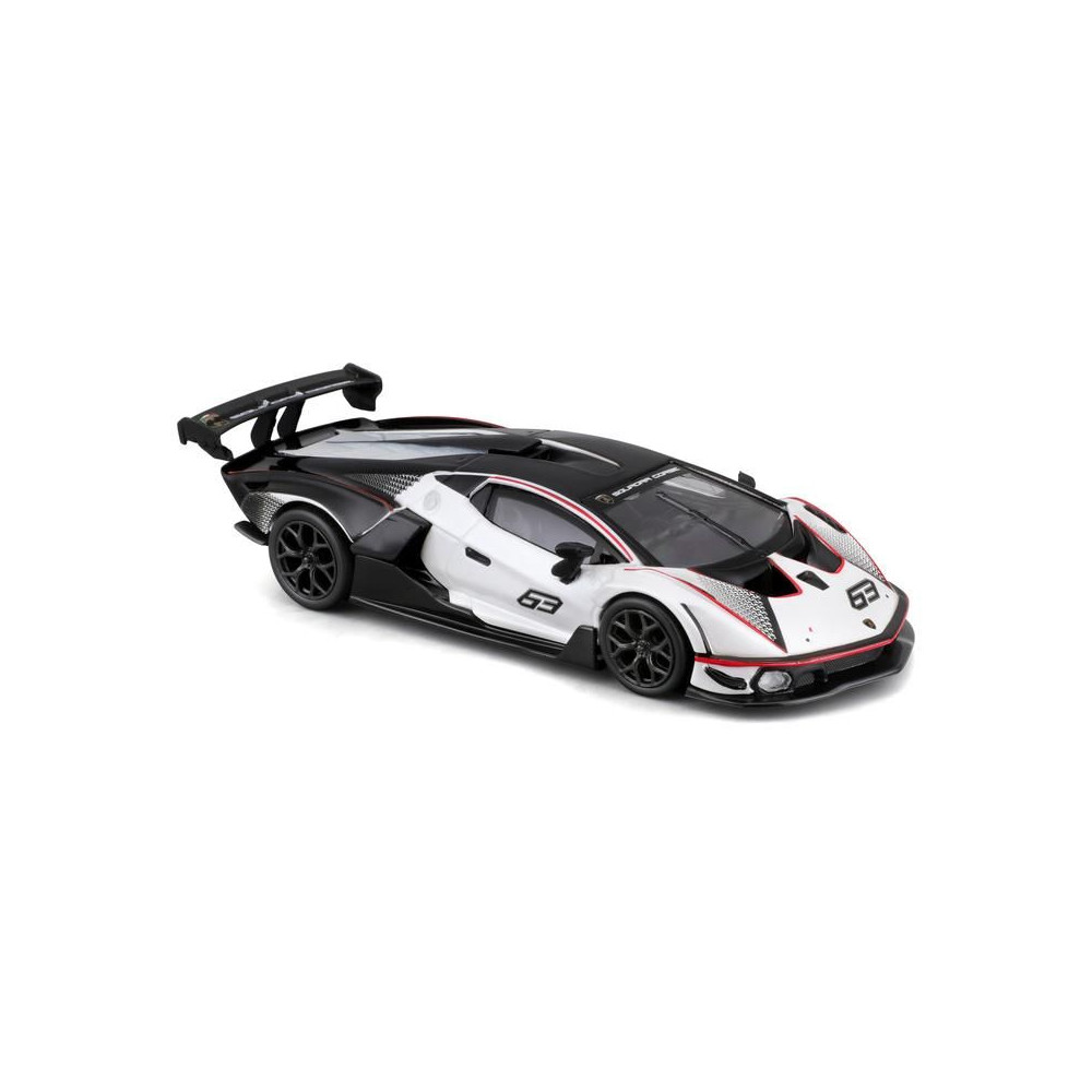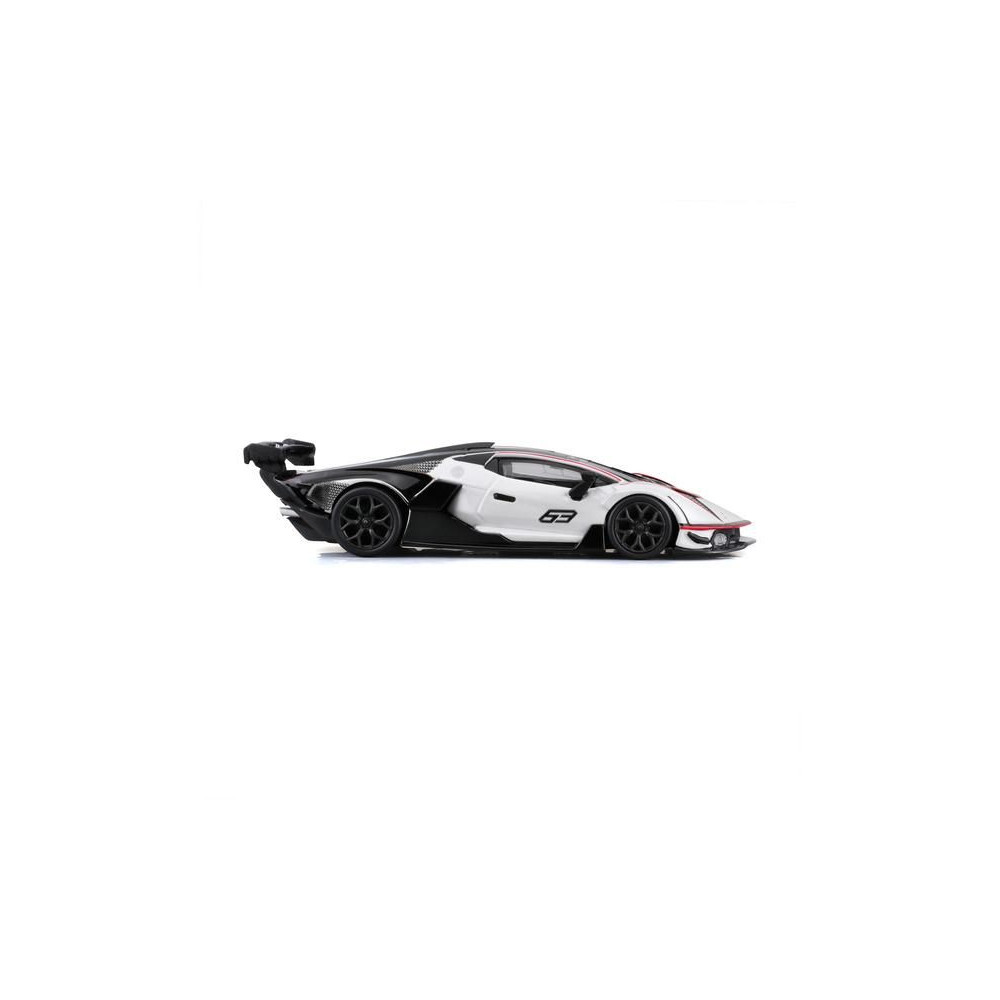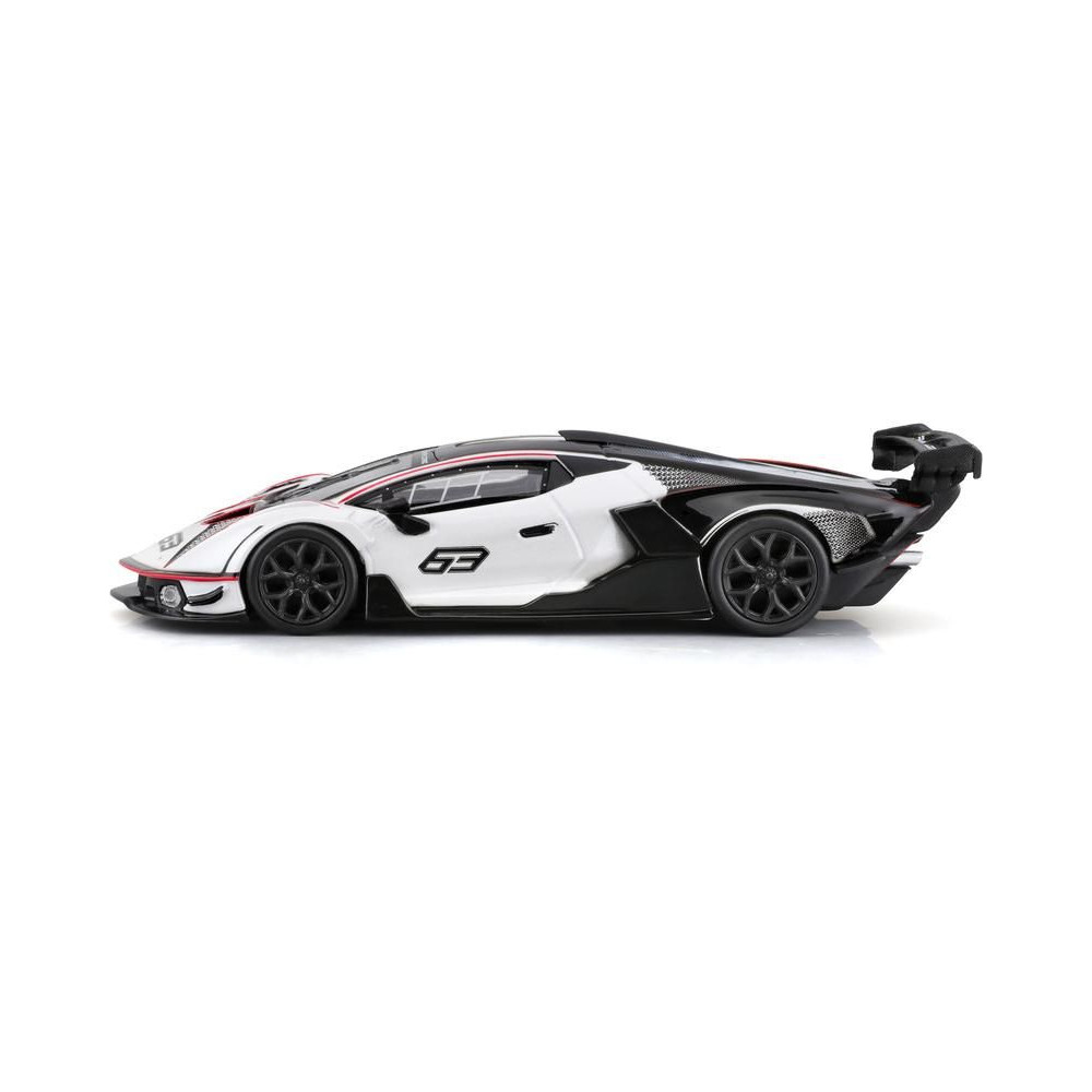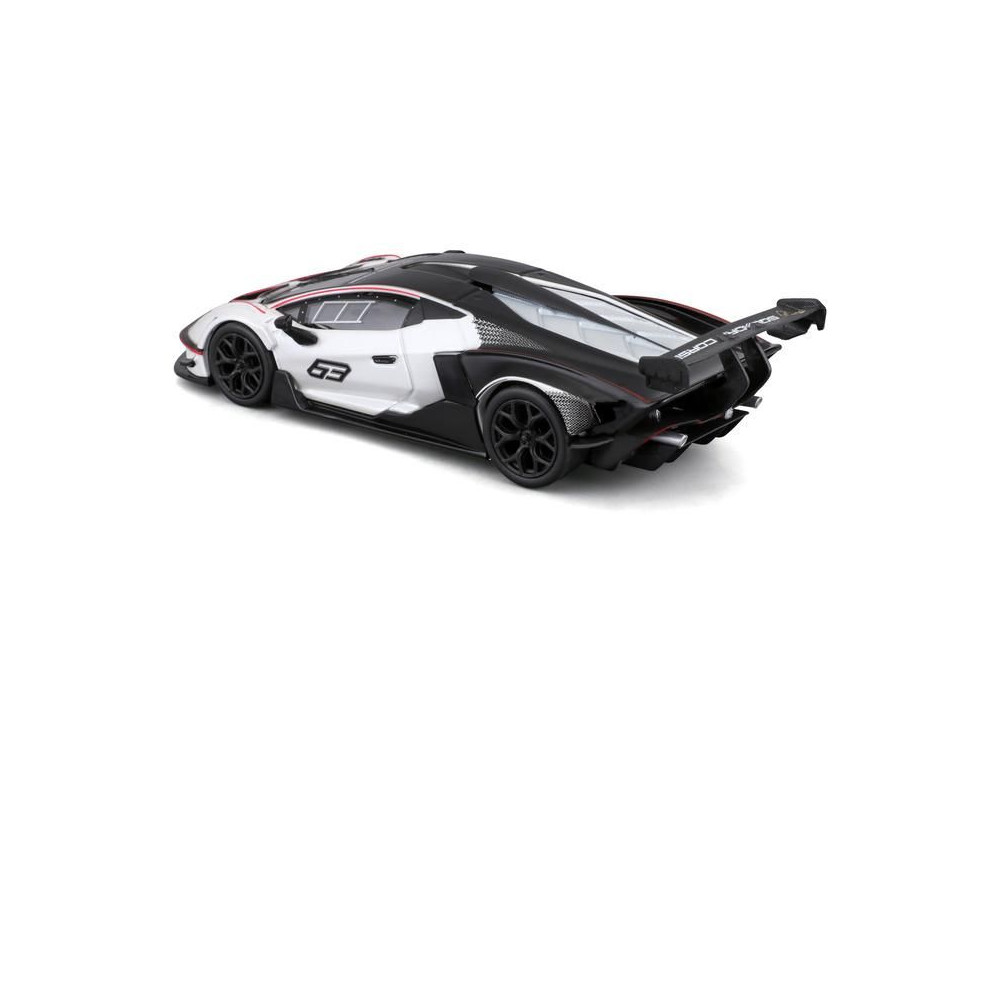Fém autómodell 1:32 Bburago 18-41161 Lamborghini Essenza SCV12 nem csak gyűjtőknek. A modell fekete-fehér színű, versenyszámmal ellátott.