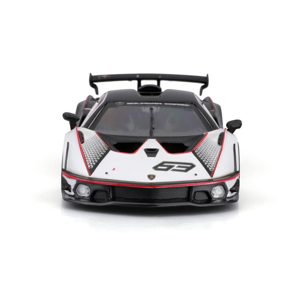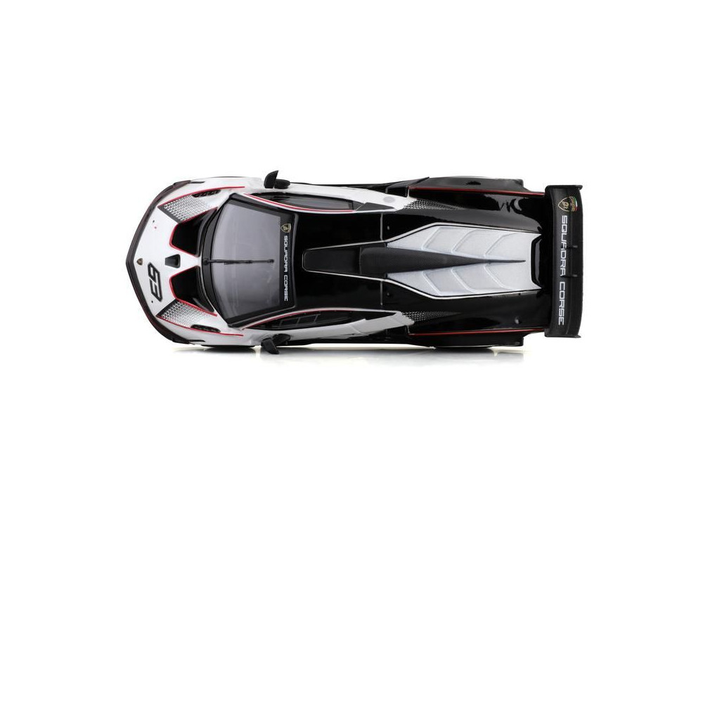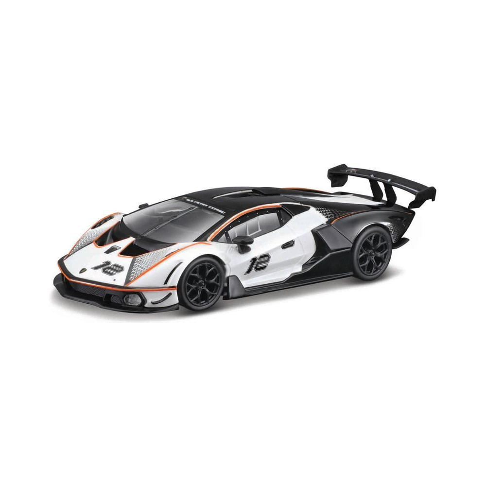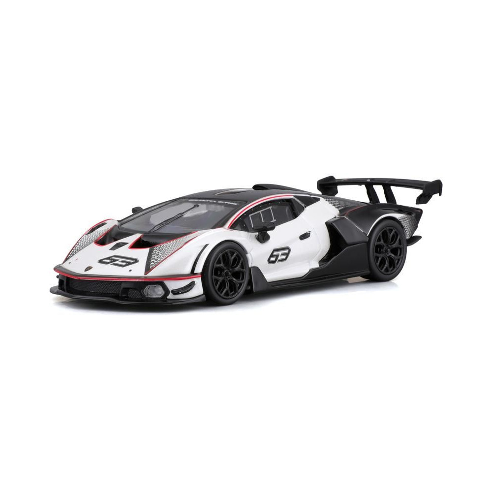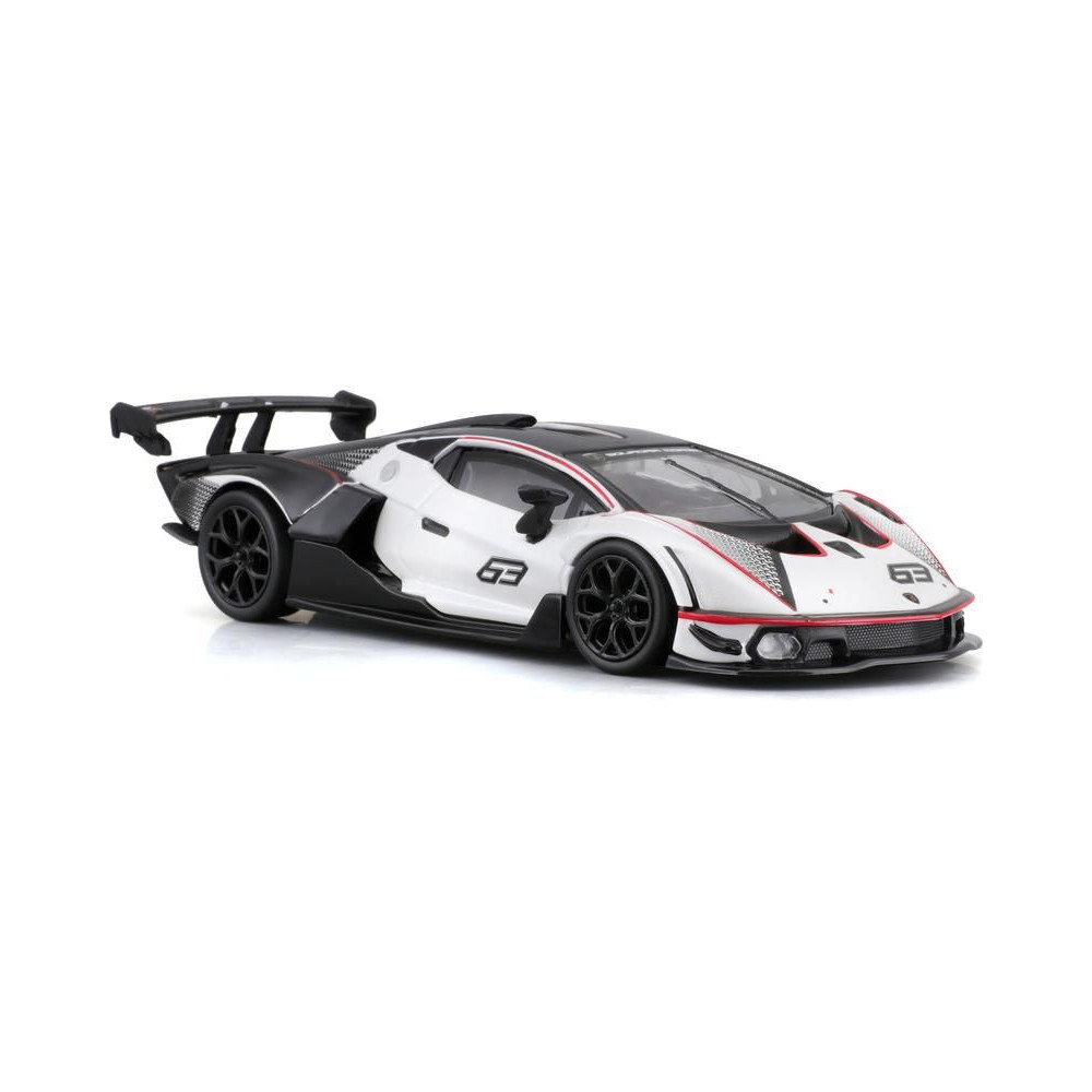 Fém autómodell 1:32 Bburago 18-41161 Lamborghini Essenza SCV12 nem csak gyűjtőknek. A modell fekete-fehér színű, versenyszámmal ellátott.