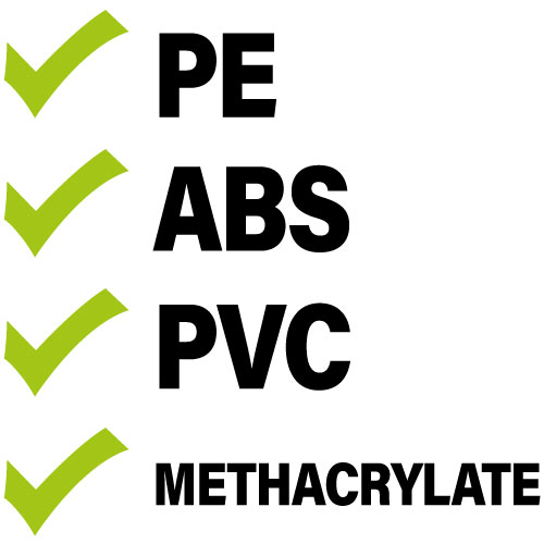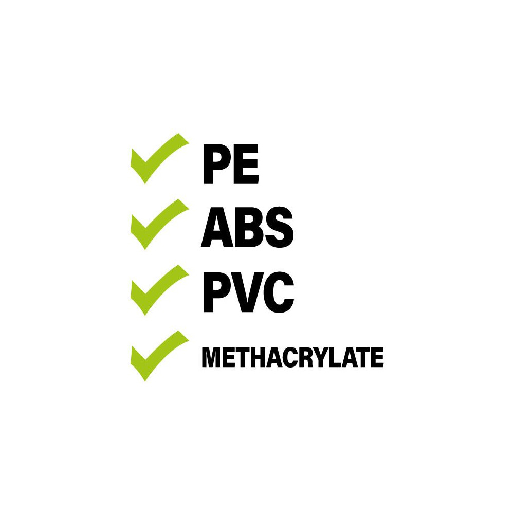 A következő műanyagtípusokra vonatkozik: polisztirol PE, ABS, metakrilát és PVC.