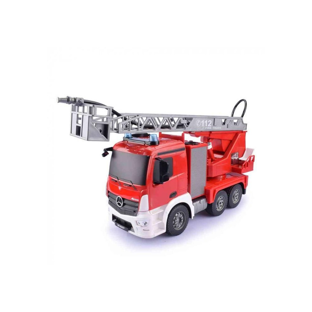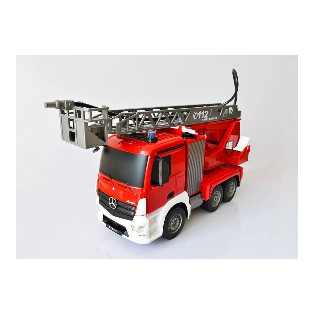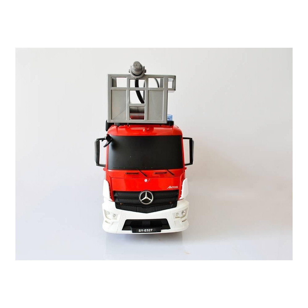 Mercedes-Benz távirányítós tűzoltóautó. Előre, hátra, balra, jobbra. A tűzoltóautó működőképes, vizet önthetsz bele, és több méter távolságból permetezhetsz.