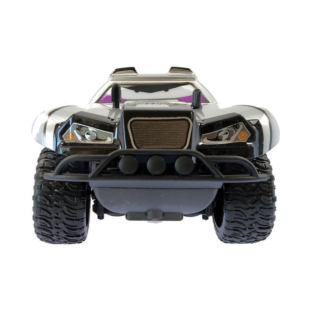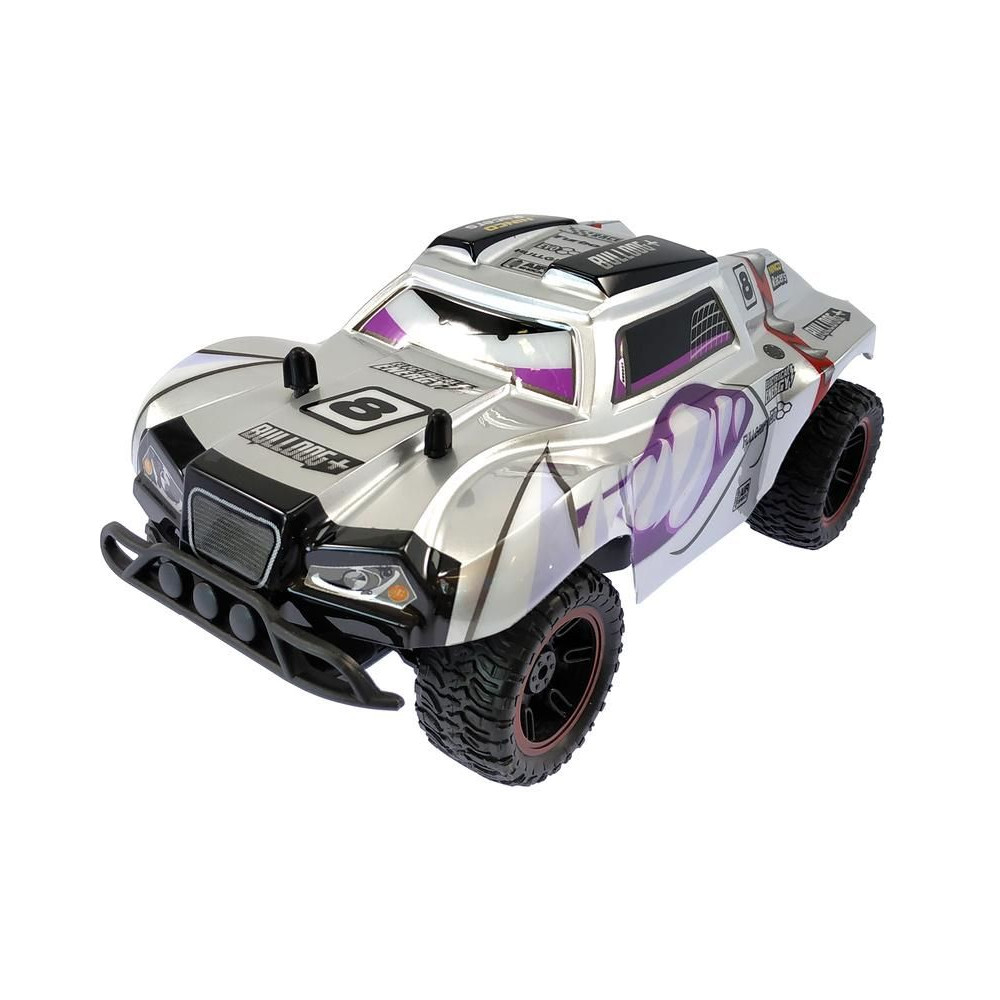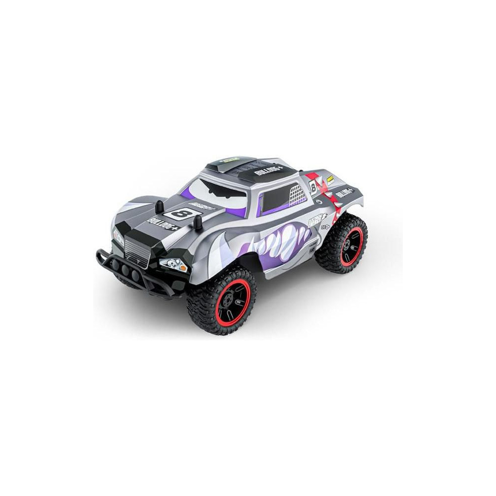 Off-road RC játék gyerekeknek Nincoracers Bulldog+ 1:18 méretarányban, közel 27 cm hosszú, a rövid pálya kategóriába tartozik. A nagyobb méreteknek köszönhetően a modell jobban leküzdi az egyenetlen terepet. Elöl védő lökhárítóval van felszerelve. A nagy kerekek a rugós lengéscsillapítókkal kombinálva tökéletesen követik a terepet. A karosszéria tartós műanyagból készült. Vonzó szürke színezésű, fogazott kutyafejekkel. A modell legfeljebb 15 km/h sebességgel halad. A modell ceruzaelemekkel működik.