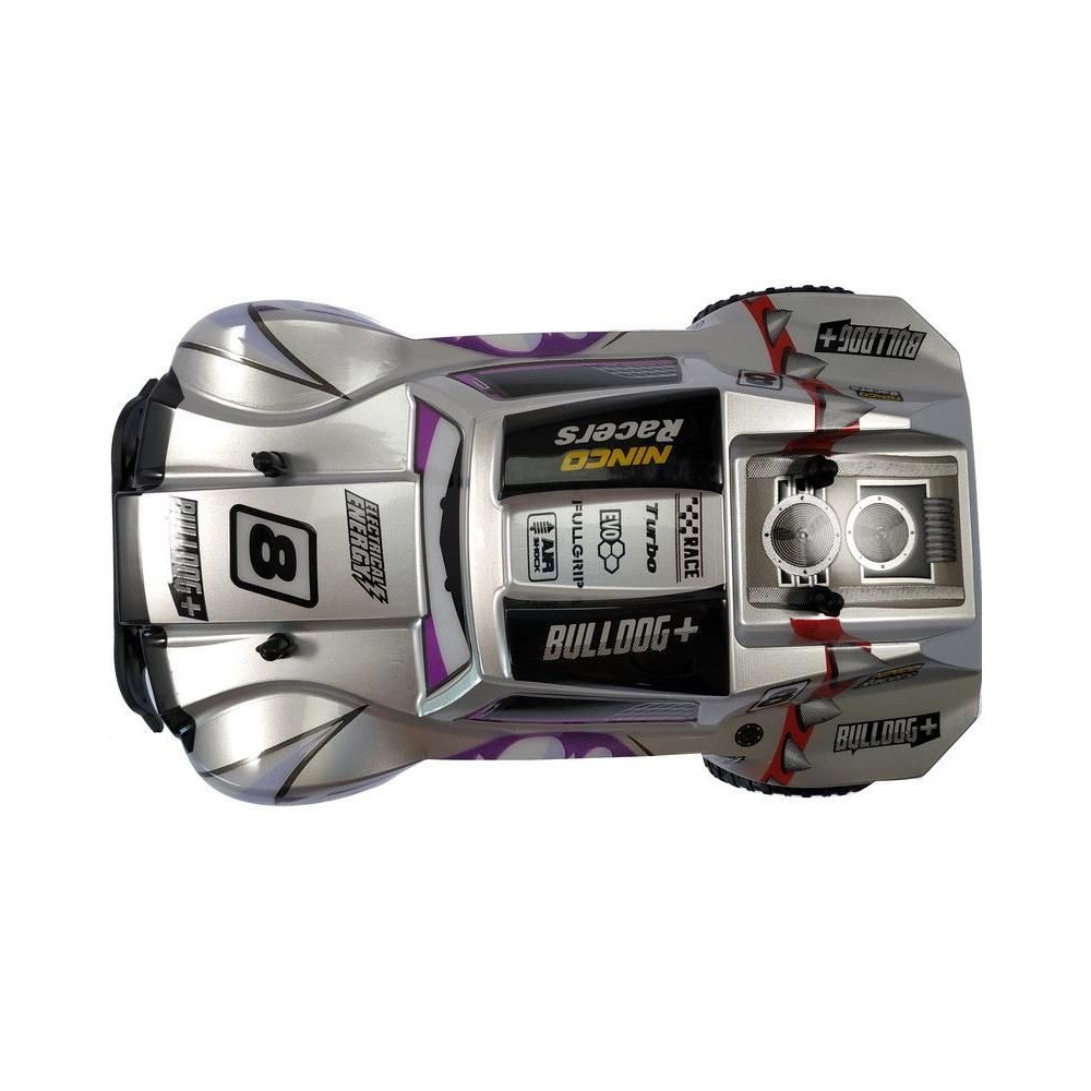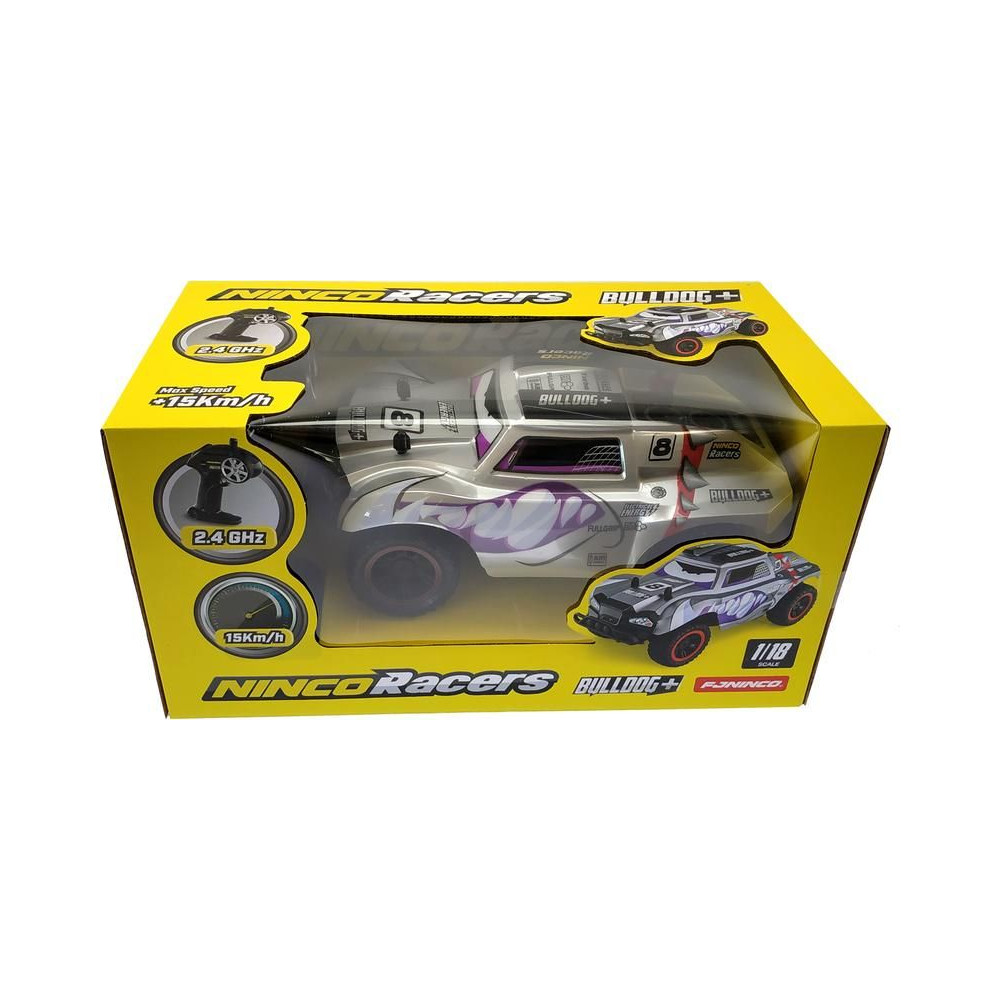 Ninco Bulldog+ távirányítós terepjáró autó 1:18 méretarányban. Az autó 26,5 cm hosszú, és akár 15 km/h sebességre is képes. Fényes szürke karosszéria dühös kutyával. Hátsó kerék meghajtással. Nagyméretű terepgumik. 2,4 GHz-es kormánykerék jeladó. A modell ceruzaelemekkel működik.