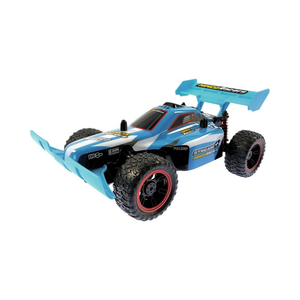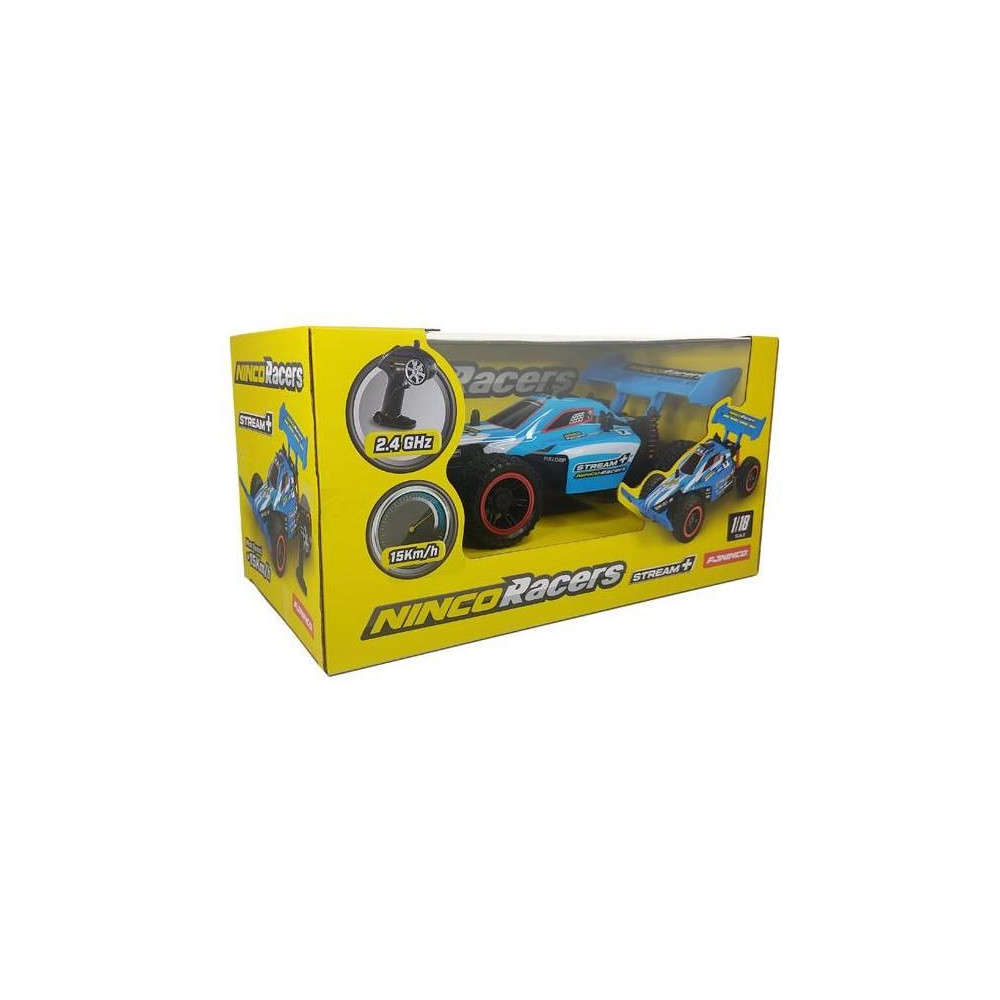 Ninco Stream+ távirányítós autó 1:18 méretarányban, Buggy kivitelben. Az autó 26,5 cm hosszú, és akár 15 km/h sebességre is képes. Kék karosszéria folyópatak motívummal. Hátsó szárny. Hátsó kerék meghajtás. Nagyméretű terepgumik. 2,4 GHz-es kormánykerék jeladó. A modell ceruzaelemekkel működik.