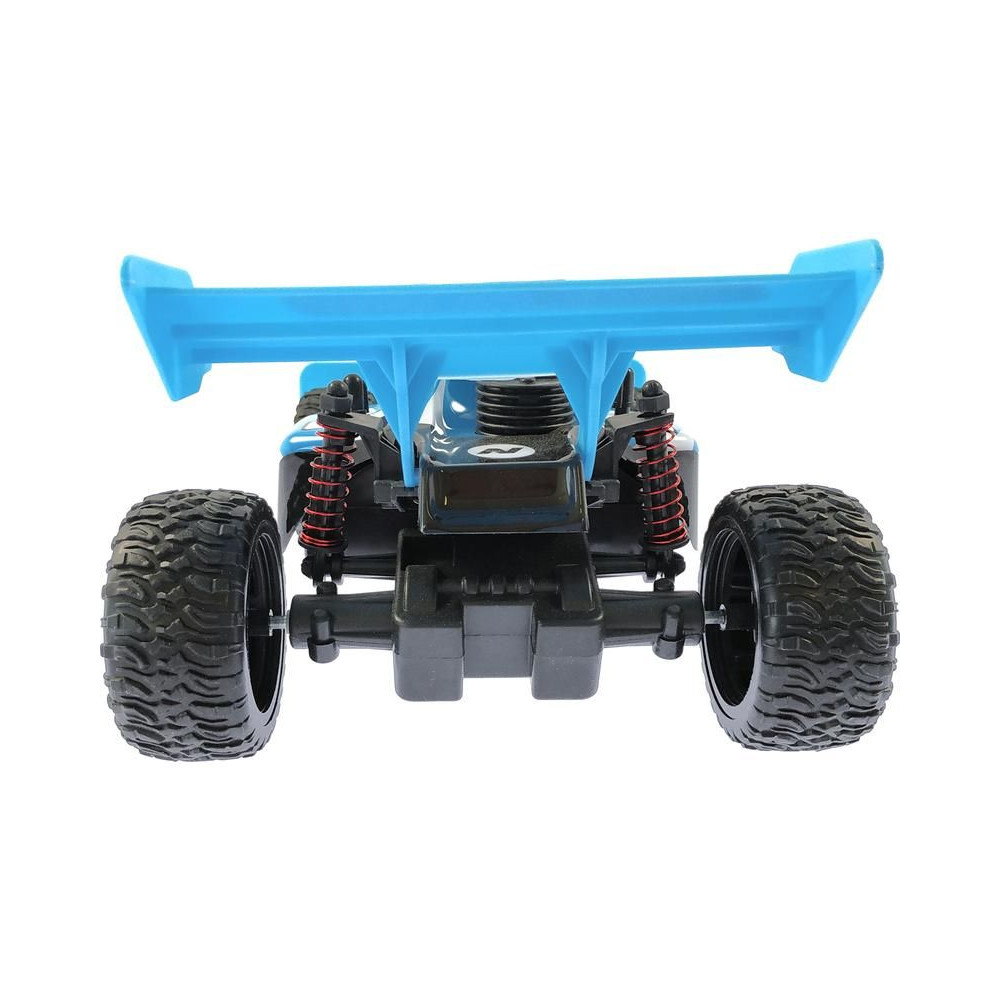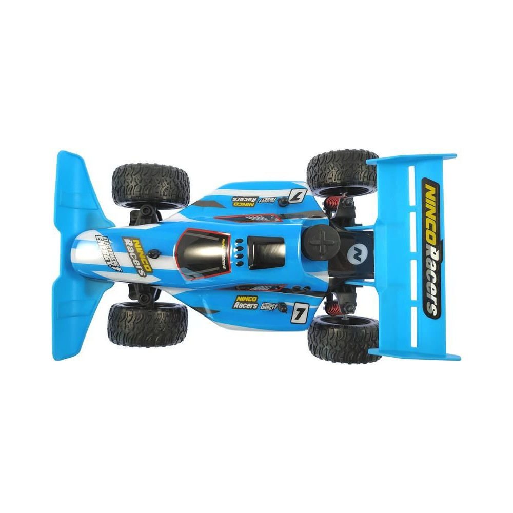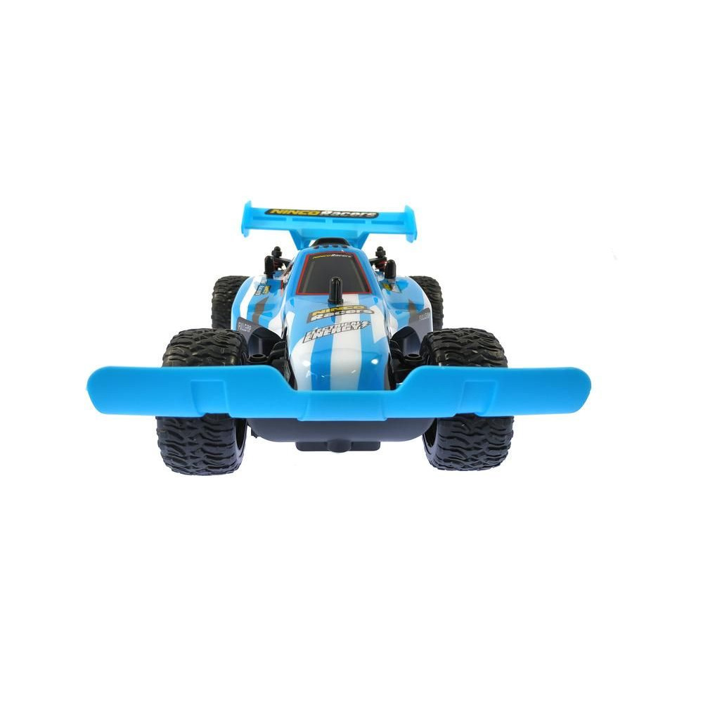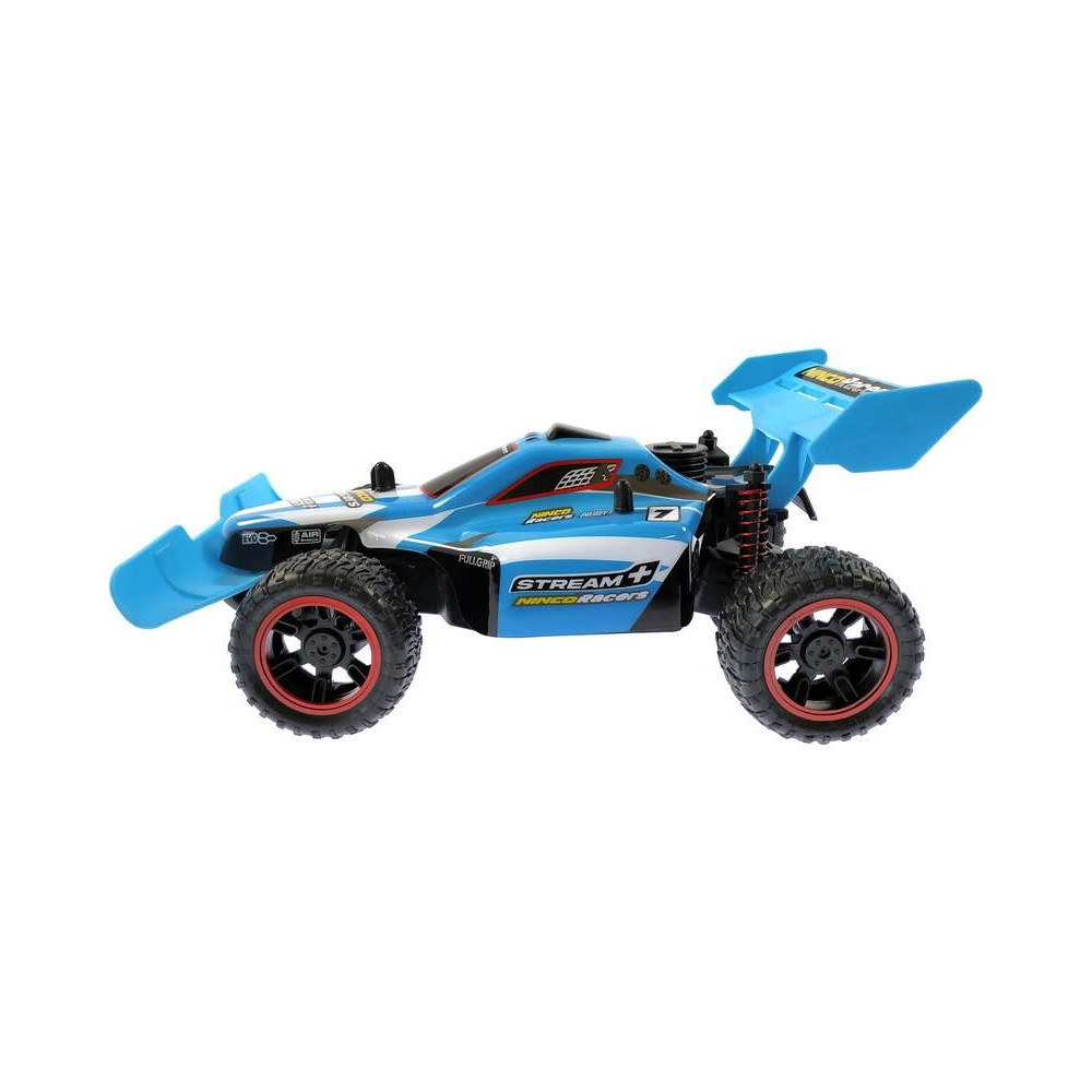 Az 1:18 méretarányú, közel 27 cm hosszú Nincoracers Stream+ off-road buggy fantasztikus RC játék minden gyereknek örömet okoz. A nagyobb méreteknek köszönhetően a modell jobban leküzdi az egyenetlen terepet. Elöl védő lökhárítóval, hátul pedig szárnnyal rendelkezik. A nagy kerekek a rugós lengéscsillapítókkal kombinálva tökéletesen követik a terepet. A karosszéria tartós műanyagból készült. Élénk kék színű, fehér csíkokkal kombinálva. A színezés a folyó-patak folyására emlékeztet. A piros lengéscsillapító rugók és a keréktárcsákon lévő piros sávok kiemelik a kiváló kialakítást. A modell legfeljebb 15 km/h sebességgel halad. A modell ceruzaelemekkel működik.