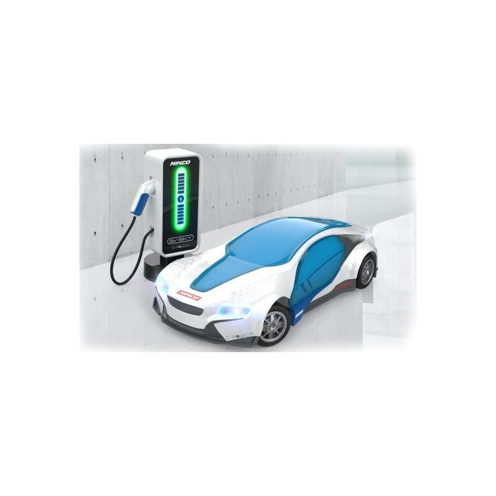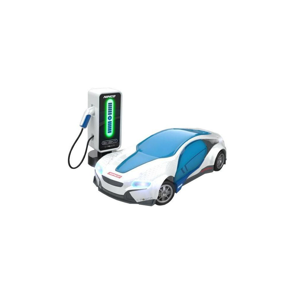 NINCORACERS EV-Sky RTR távirányítós autó töltőállomással (3,7 V 1200 mAh külső akkumulátorként is funkcionál). Hatékony LED világítás elöl és hátul 5 üzemmóddal. Az automatikus parkolás speciális funkciója. Autó- és kürthangok. 2,4 GHz-es adó. Autóakkumulátor Li-ion 3,7 V 500 mAh.