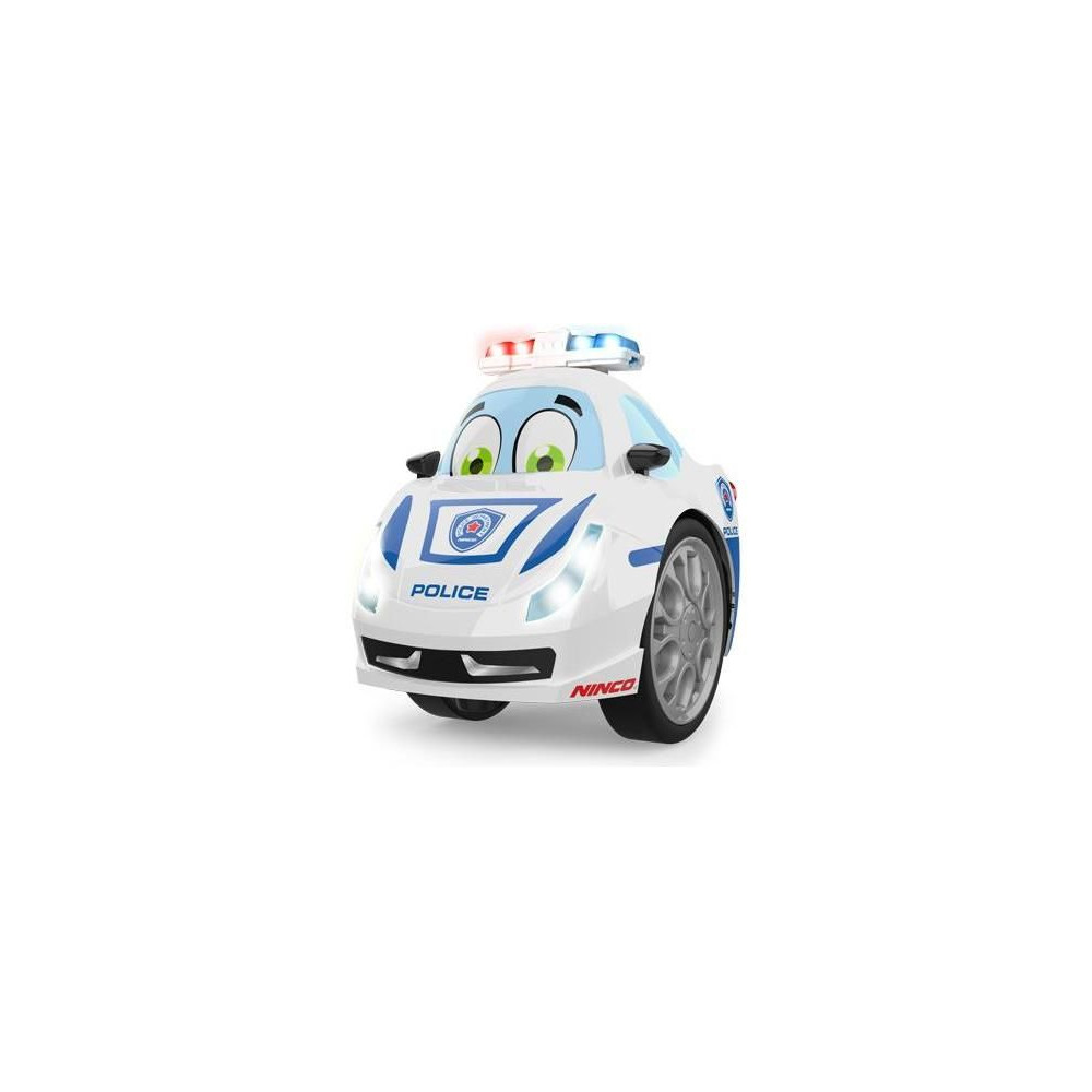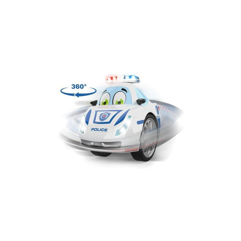 Két kerékkel ellátott, kettős rendőrségi távirányítós autó, amely lehetővé teszi a normál vezetést és a vad 360°-os fordulatokat. A gyermekmotívumos autó szemet gyönyörködtető LED világítással (első és hátsó lámpák, villogó) rendelkezik, és hangokat ad ki. Az autót hat AA típusú elem táplálja (4 db a játékautóhoz, 2 db az adóhoz) (az elemek nem részei a csomagnak). Az adó 27 MHz frekvencián működik, és 15 méteres hatótávolsággal rendelkezik.