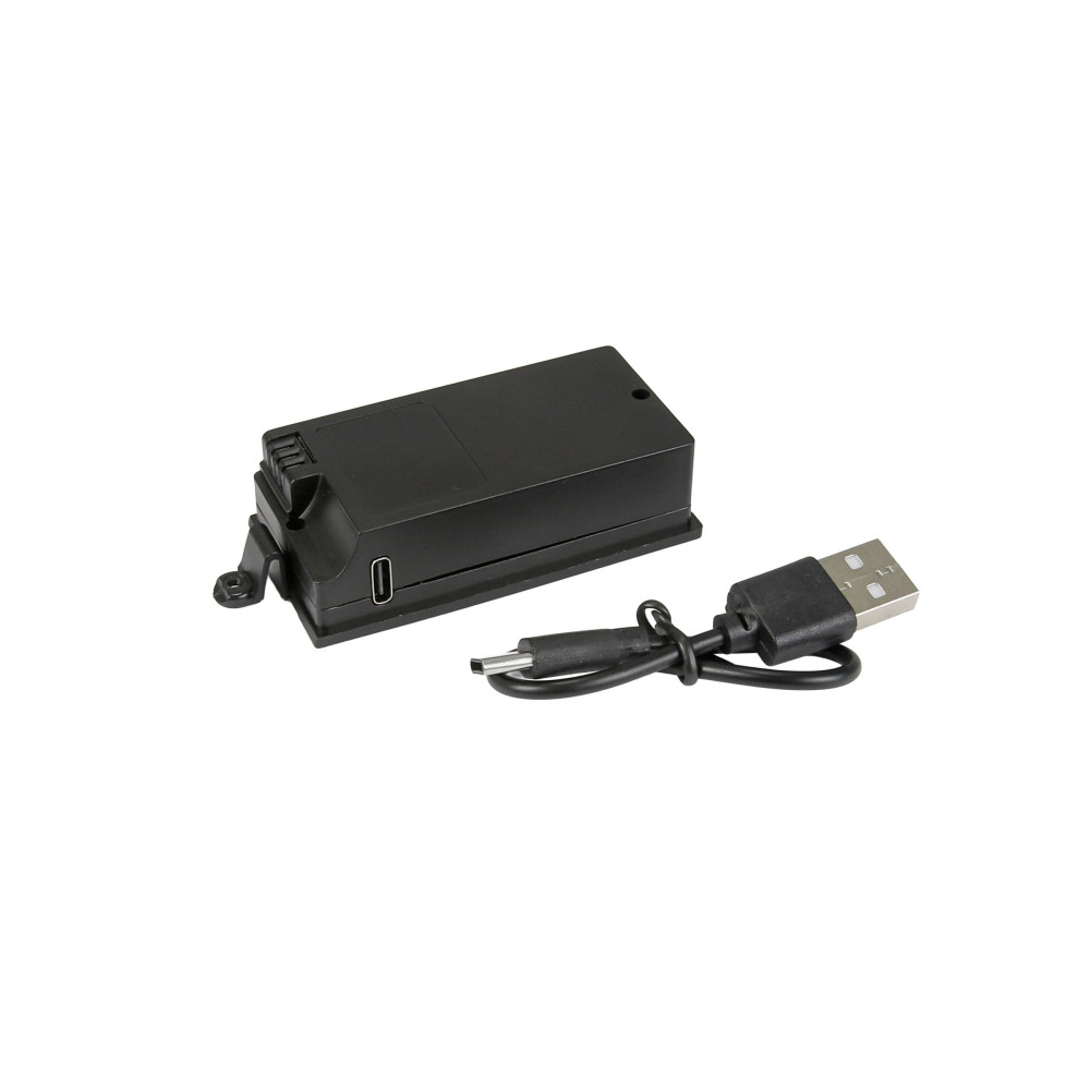 Akkumulátor: LiPo 1S 3,7 V 500 mAh, keménytok, USB-C töltőcsatlakozóval, méretek 67 × 34 × 19 mm, súly 27 g