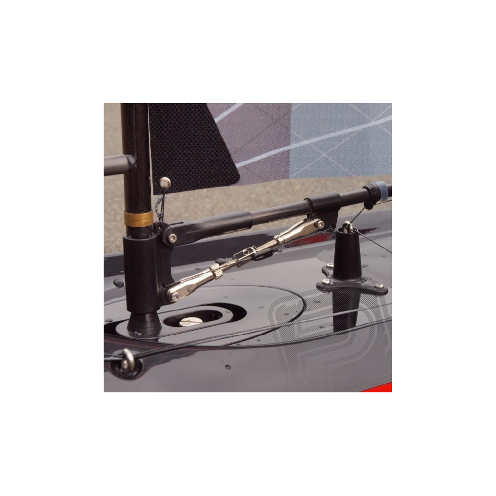 A kétrészes árboc karboncsőből készült, akárcsak a vitorlaszár; az árboc alkatrészeinek végeit fémgyűrűk védik a töréstől. A fővitorla gémje állítható rugóstaggal két golyóscsapágyra van szerelve. A vitorlák erős, szakadásálló szintetikus anyagból (Dacron) készültek, a vitorlák végei ragasztott műanyag fóliával vannak megerősítve. A rögzített kötélzet (szuper erős Dyneema szálakból készült) a szokásos feszítőcsavarokkal lehetővé teszi az árboc helyzetének széles tartományban történő beállítását, az árboc talpa is mozgatható.