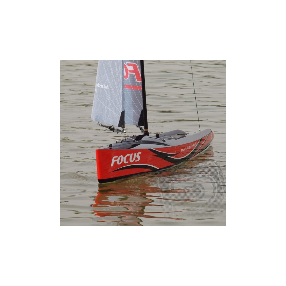 A FOCUS II egy 1M osztályú versenyvitorlás modell, amellyel kiválóan vitorlázhatsz bármilyen nagyobb vízfelületen. Nagyobb méretei ("méteres" hajótest és 2046 mm-es teljes magasság) ellenére, a könnyen levehető kétrészes árbocnak és gerincnek köszönhetően könnyen szállítható hűséges társ hétvégi kirándulásokon vagy vízparti nyaralásokon. Csupán négy ólom alkáli elemre vagy akkumulátorra van szükséged az adóhoz és négyre a vevőhöz, rögzítsd az árbocot, a gerincet, a kormánylapátot és a vitorlákat - és már indulhatsz is. A FOCUS II távirányítású készletként kerül kiszállításra - egy előre összeszerelt vitorláshajó beépített elektronikával és egy négycsatornás proporcionális 2,4 GHz-es adóval.
