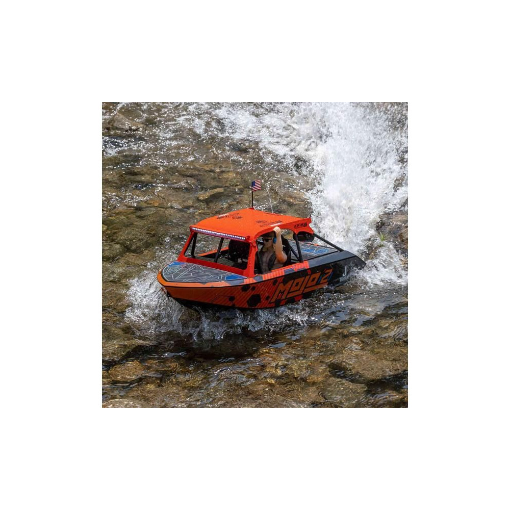 Az első RC modell egy "bash" típusú csónakról, amely vízfúvókával rendelkezik az őrült mutatványok végrehajtásához. Akár sekély patakba, akár vadvizekre megy, a modell mindig hihetetlenül gyors és fürge lesz. Mivel a modell nem tartalmaz hajócsavart vagy kormánylapátot, oda is eljuthat, ahová más RC csónak nem.