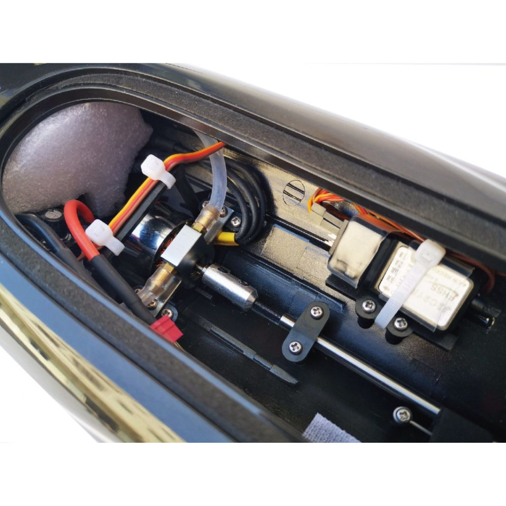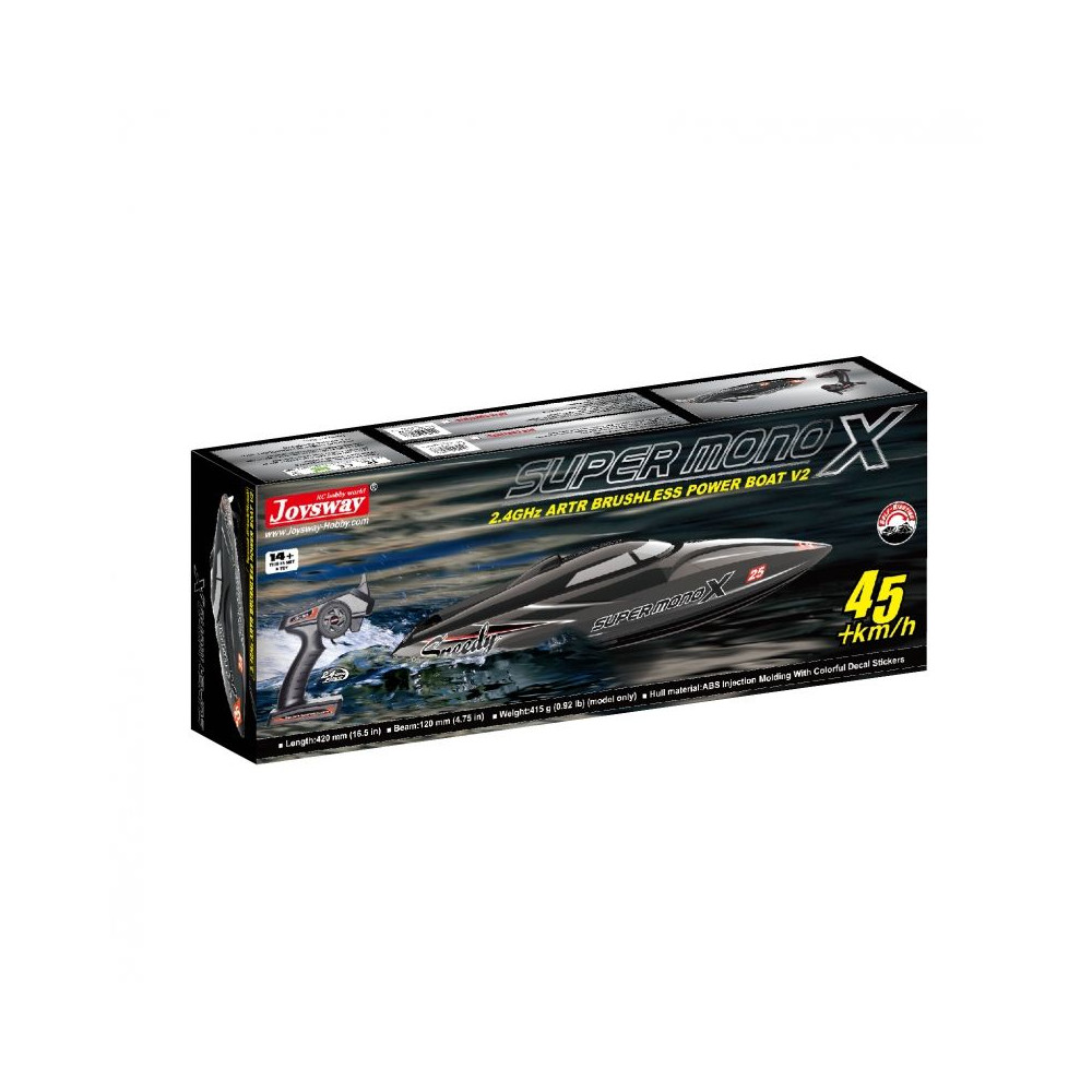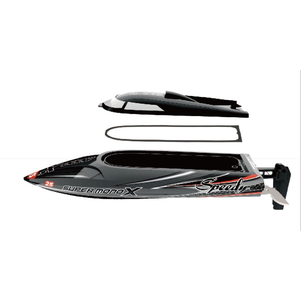 Műanyag hajótest 360mm-es gyorsasági hajó modell (teljes hossza 420mm), vízhűtéses kefe nélküli motorral, vízhűtéses 30A vezérlővel, szervóval és kétcsatornás 2.4GHz-es RC készlettel. A csomag nem tartalmazza a meghajtó akkumulátort (11,1V 1300-1800mAh 35C dopor. akkumulátor) és a töltőt. A modell 45km/h sebességet ér el.