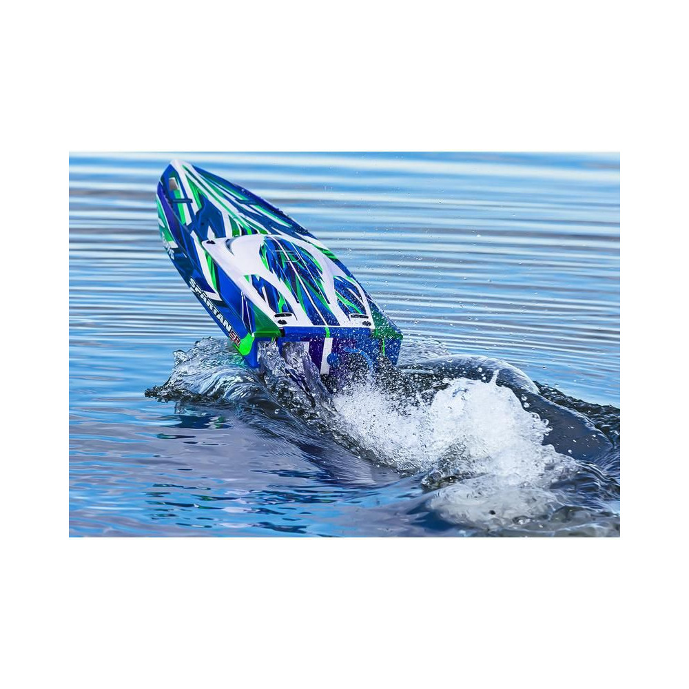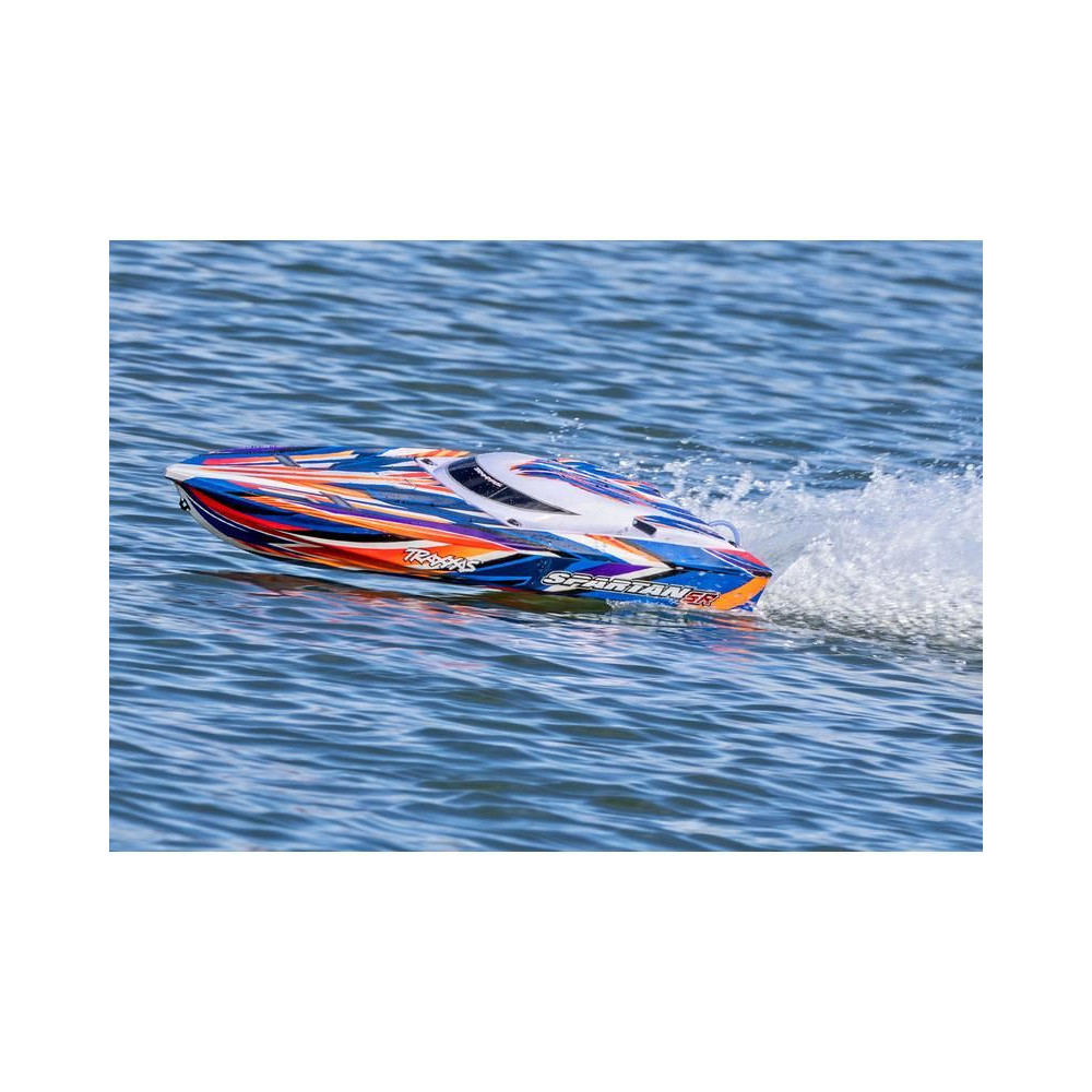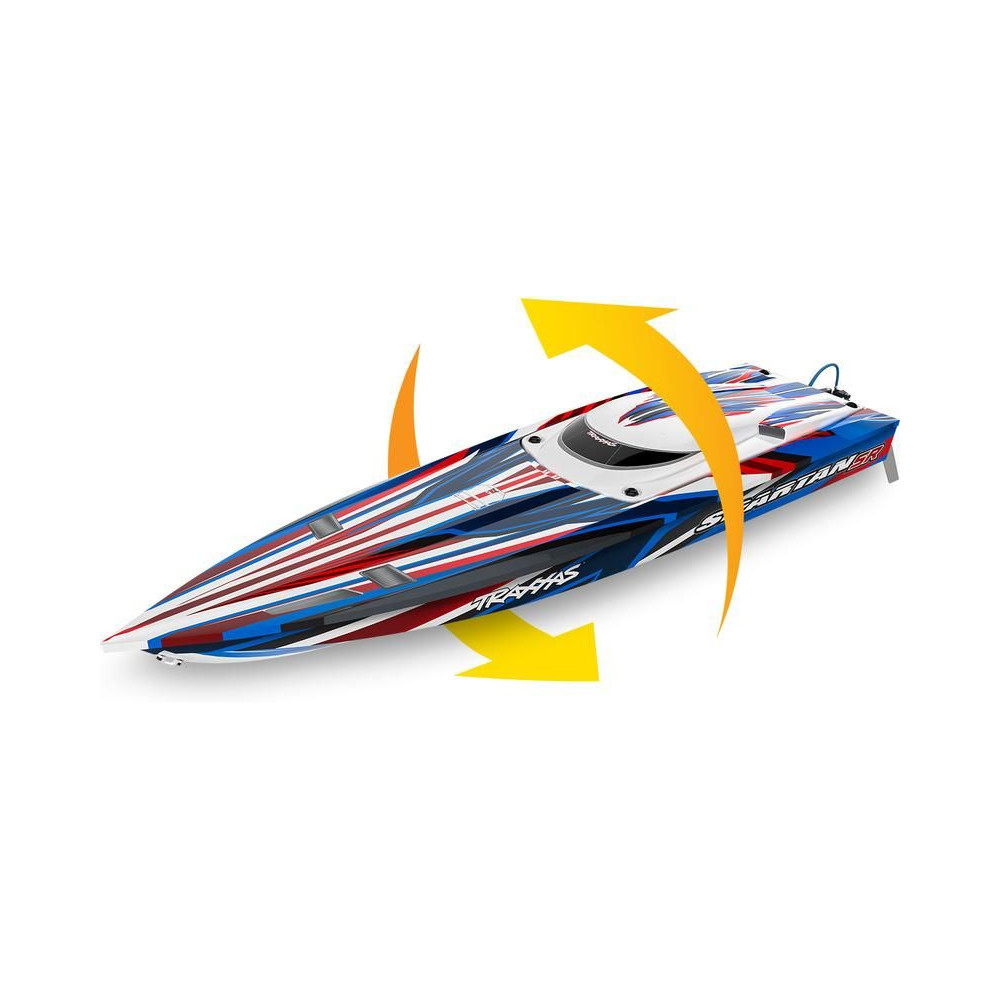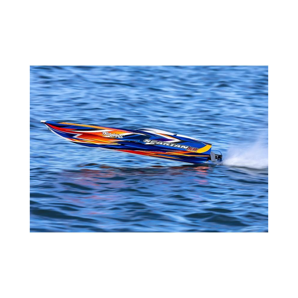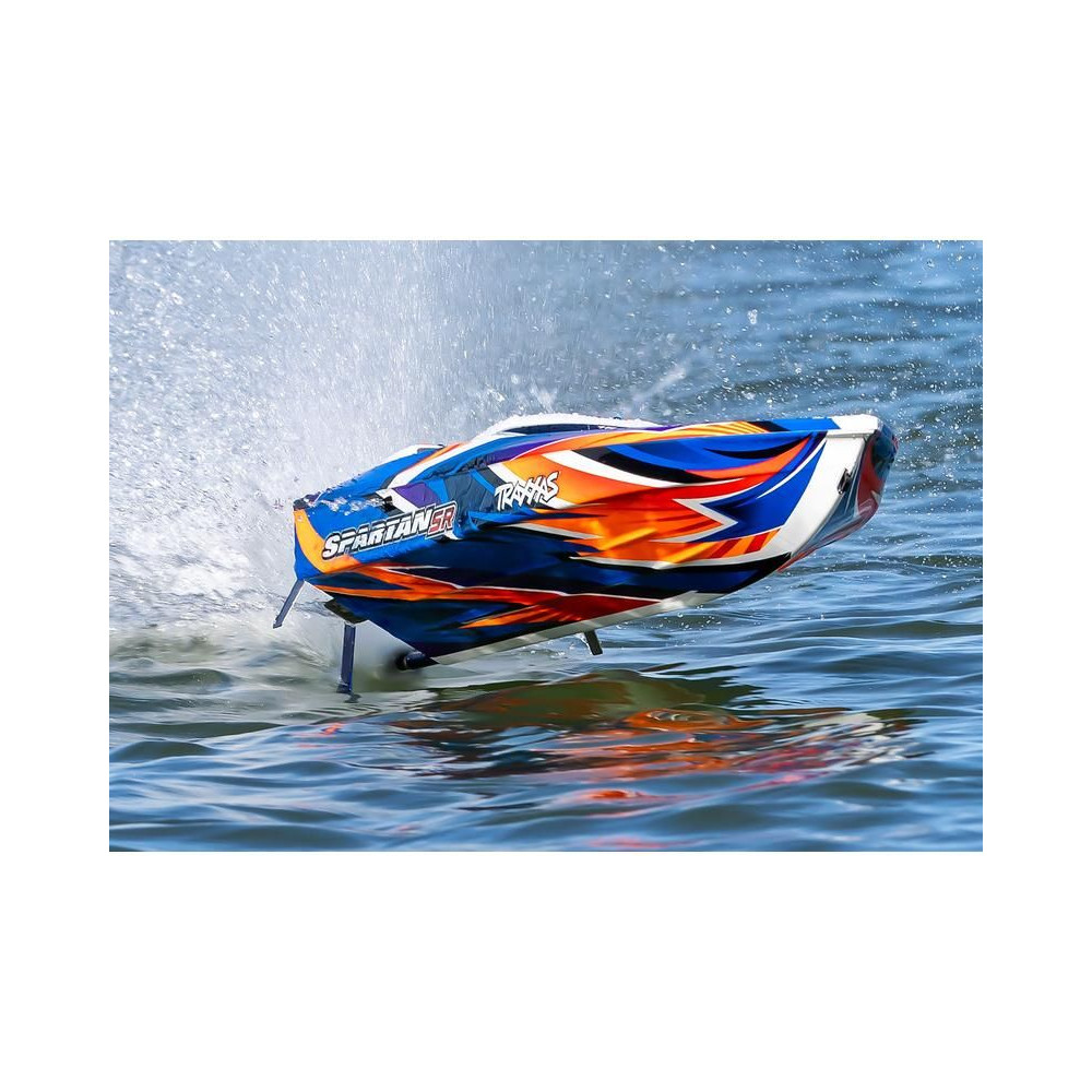 Rendkívül erős és gyors RC modell Traxxas Spartan SR 36" AC motorral és vízhűtéssel. Sebessége akár 80 km/h. Exkluzív auto-turn funkció felborulás esetén. Mély-V hajótest a precíz és gyors kormányzáshoz. Csatolásmentes borítás. TSM elektronikus stabilizátor.