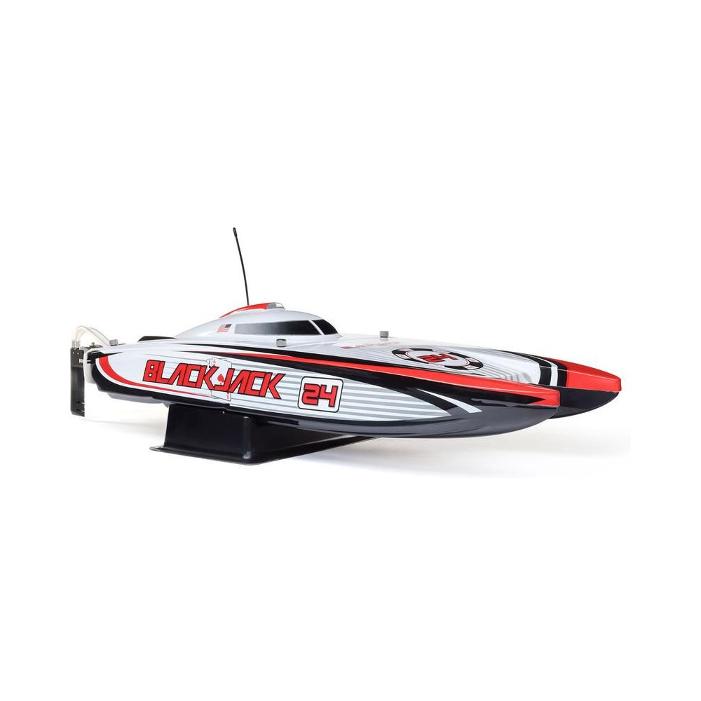 Proboat Blackjack 24" V2 V2 sebességű RC katamarán modell nagy teljesítményű Spektrum Firma 4S AC meghajtóval és 48 km/h sebességgel. Egyszerű hajótest akkumulátor telepítés, egyszerűsített tengelykenés, csuklós kormány, sérülésgátló, 2 csatornás SLT2 2,4 GHz-es adó.
