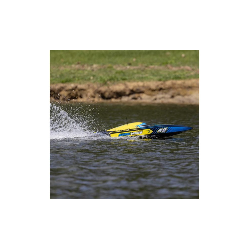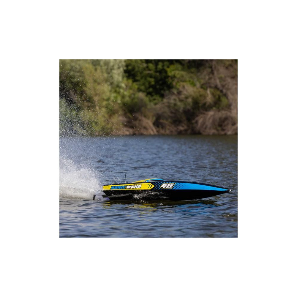 Sebessége és mérete miatt a Super Sonicwake 48" a legalkalmasabb nagy tavakra, gátakra stb. A vízpartról való biztonságos és kényelmes utazás gondtalan. Ha a csónak felborul, magától visszafordul. A Spektrum DX3 jeladó akkumulátorjelzője tudatja Önnel, hogy mikor kell visszatérnie a partra. A Super Sonicwake 48" a legjobb tulajdonságokkal, a legjobb teljesítménnyel és a legnagyobb méretével minden más csónakot ki fog ütni a vízből.
