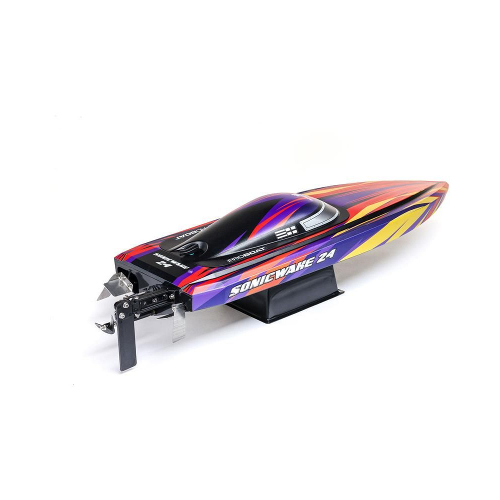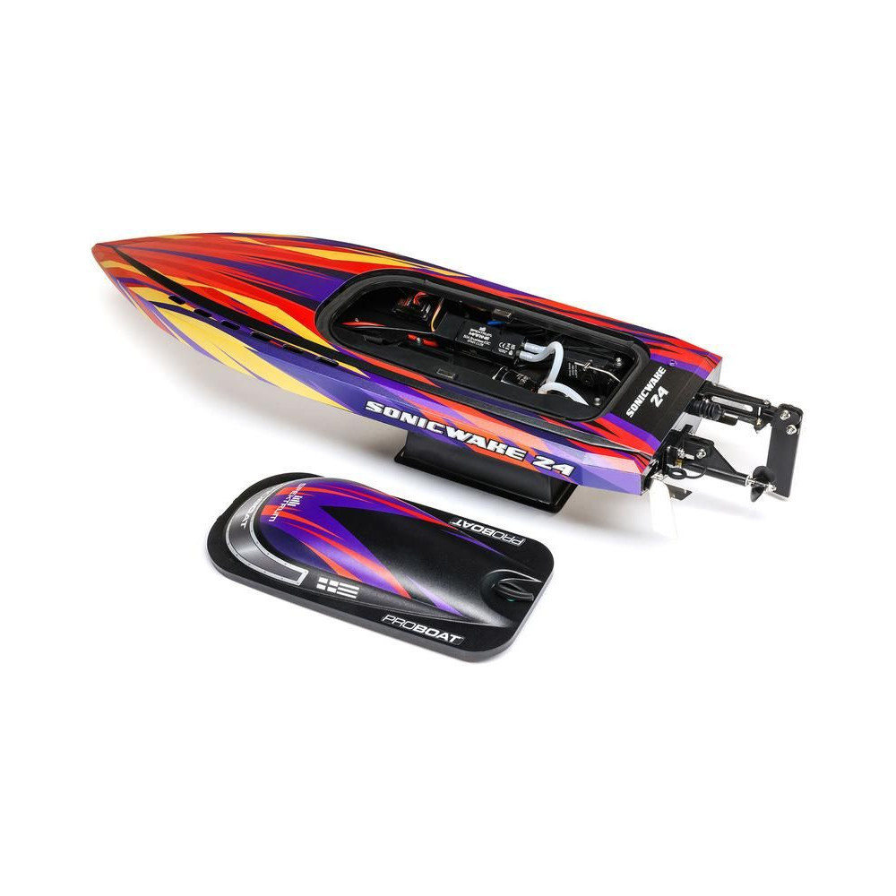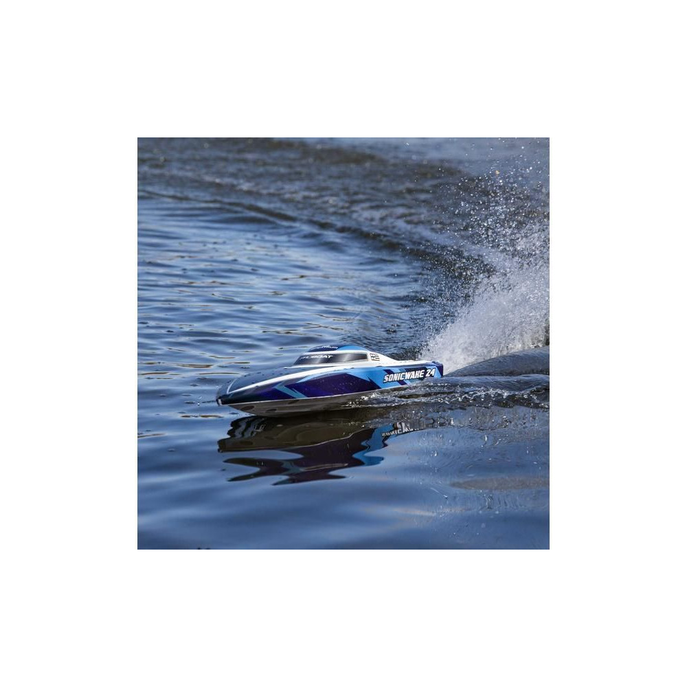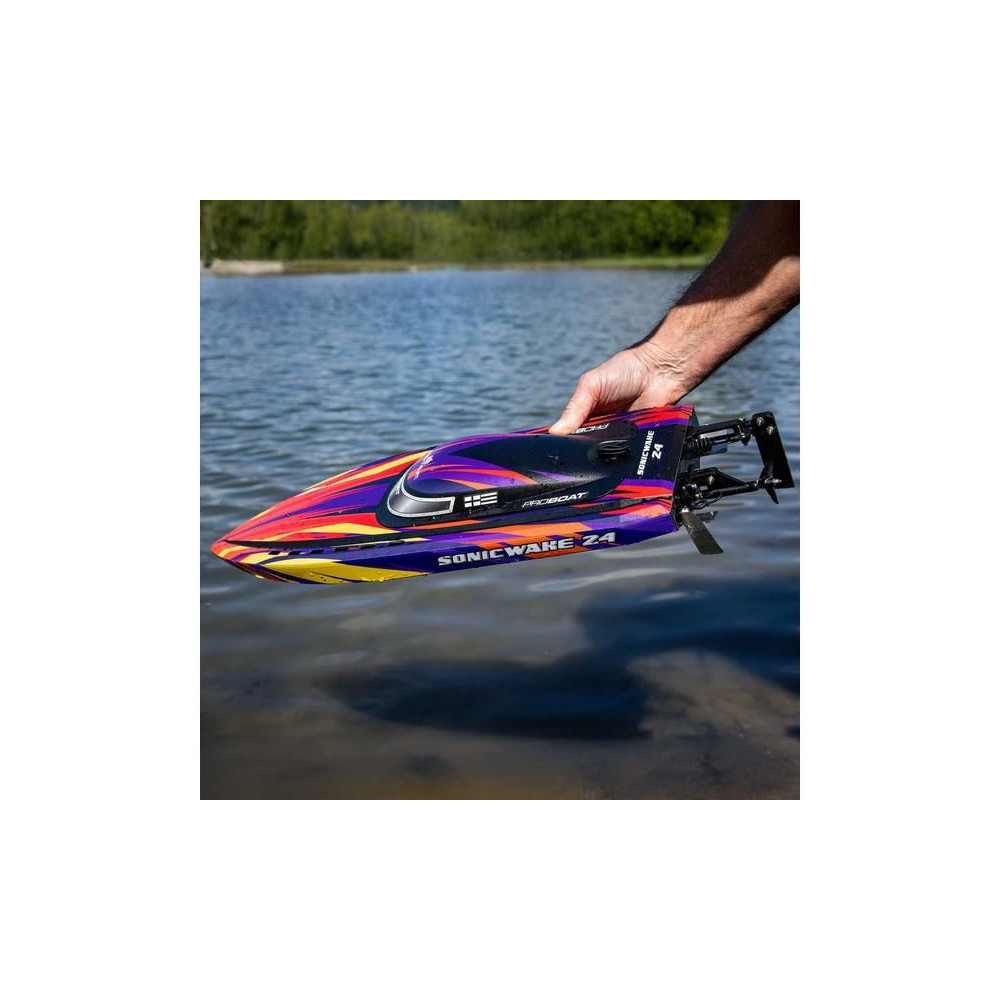 A Proboat Sonicwake 24"-os motorcsónak a Sonicwake sorozat nagyobb hajóinak bevált tulajdonságaira épül, és még a közepes méretű RC hajómodellek kategóriájában is megfizethető szórakozást kínál. Ezáltal a hajó alkalmas első RC hajóként kezdők számára, akik teljesítményre és izgalomra vágynak. Funkcióinak és akár 56 km/h sebességének köszönhetően a tapasztalt RC vezetőket is elkápráztatja. 61 cm-es hosszával a Sonicwake nagyobb, mint a medencehajók, de még így sem feltétlenül van szükség nagy vízfelületre a hajózáshoz. Egy kis tó vagy hasonló hely minden szükséges helyet kínál. A modell fő előnyei közé tartozik az automatikus fordulófunkció (önkiegyenesítés) és a Proboat márka precíz kidolgozása, amely hosszú és kényelmes működést biztosít az alkatrészek támogatásával. A csomag tartalmaz egy LiPo akkumulátort és egy USB-C töltőt is.