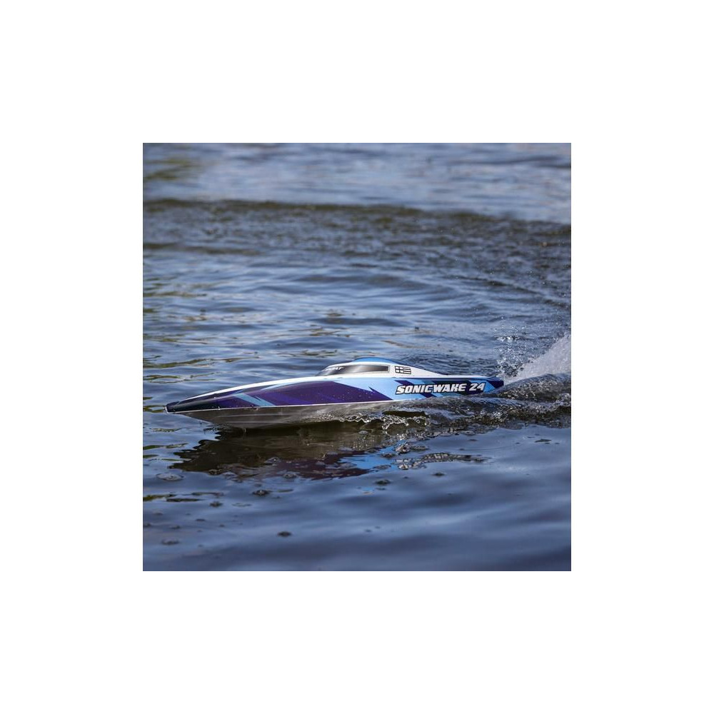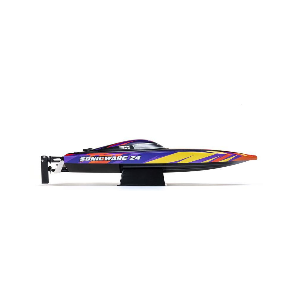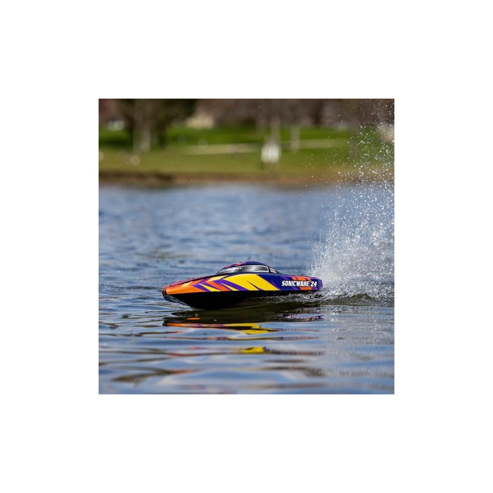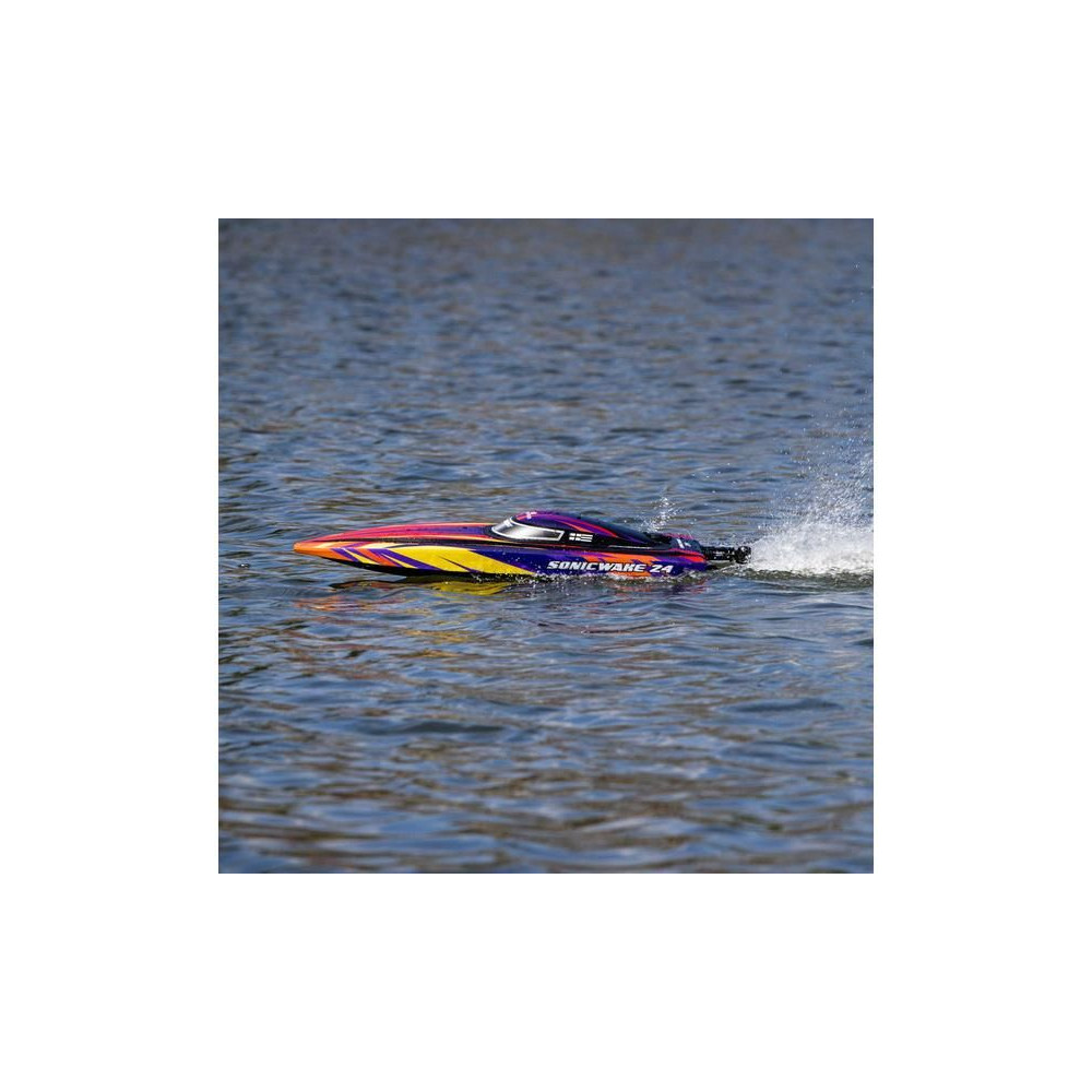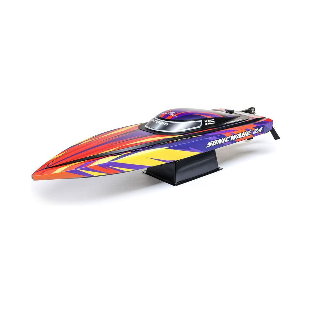 A Proboat Sonicwake 24"-os motorcsónak a Sonicwake sorozat nagyobb hajóinak bevált tulajdonságaira épül, és még a közepes méretű RC hajómodellek kategóriájában is megfizethető szórakozást kínál. Ezáltal a hajó alkalmas első RC hajóként kezdők számára, akik teljesítményre és izgalomra vágynak. Funkcióinak és akár 56 km/h sebességének köszönhetően a tapasztalt RC vezetőket is elkápráztatja. 61 cm-es hosszával a Sonicwake nagyobb, mint a medencehajók, de még így sem feltétlenül van szükség nagy vízfelületre a hajózáshoz. Egy kis tó vagy hasonló hely minden szükséges helyet kínál. A modell fő előnyei közé tartozik az automatikus fordulófunkció (önkiegyenesítés) és a Proboat márka precíz kidolgozása, amely hosszú és kényelmes működést biztosít az alkatrészek támogatásával. A csomag tartalmaz egy LiPo akkumulátort és egy USB-C töltőt is.