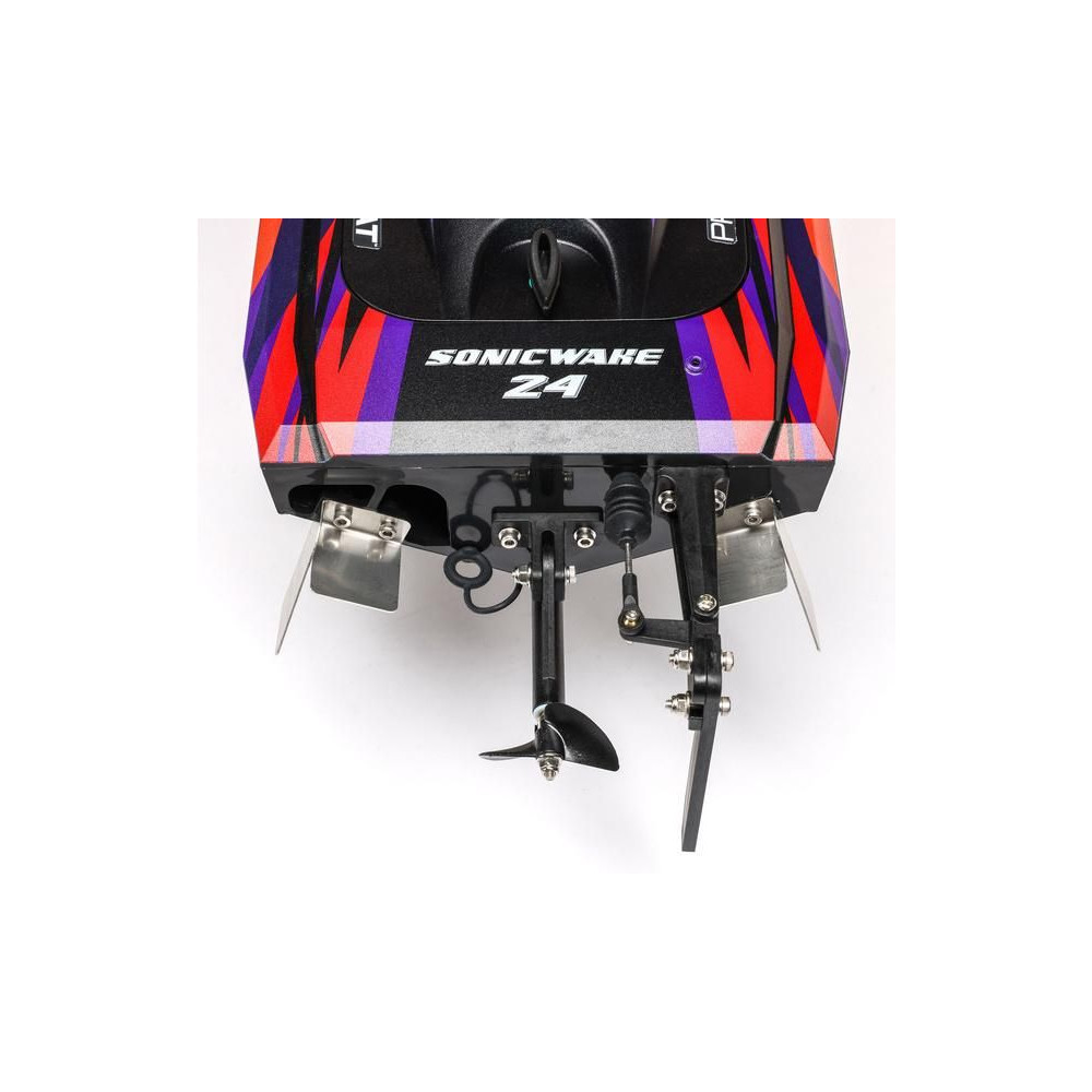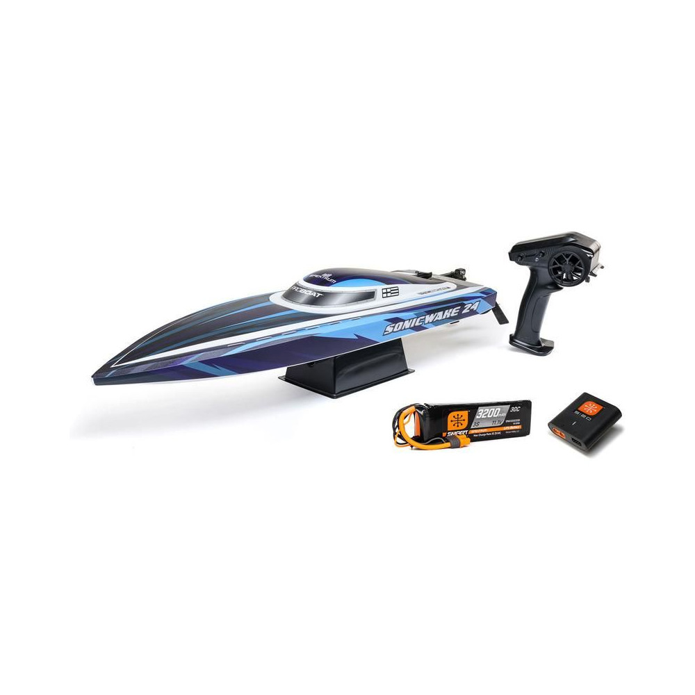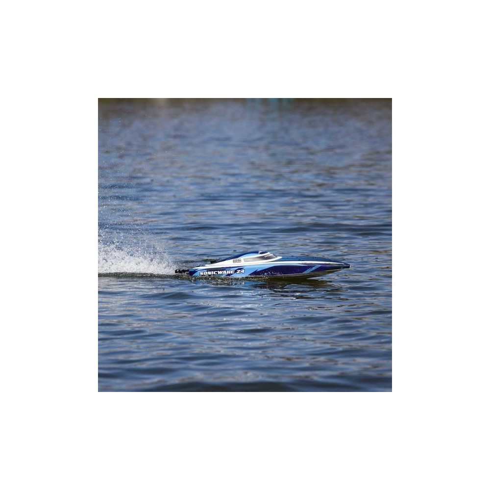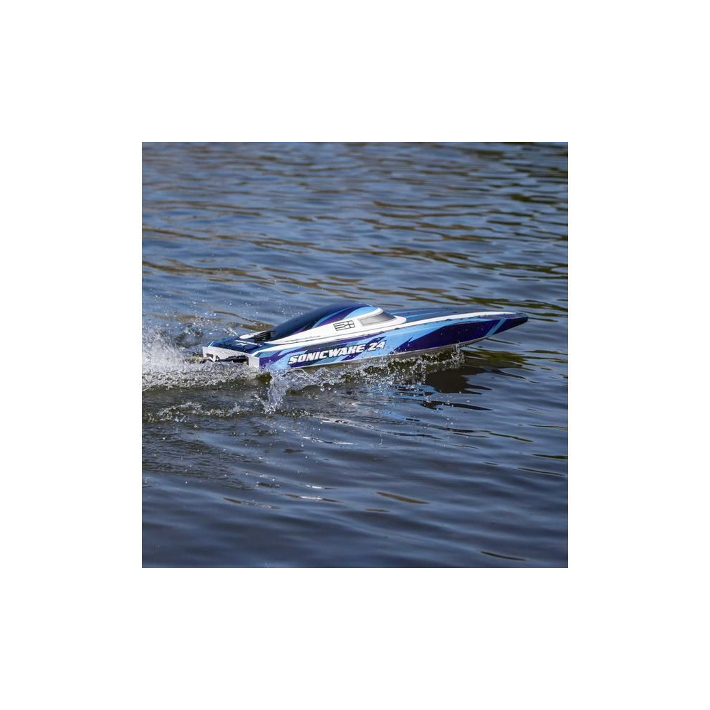 Közepes méretű Proboat Sonicwake 24" motorcsónak exkluzív önkiegyenesítő funkcióval. Vízhűtéses 2500 kV-os váltóáramú motor és Spektrum 50A szabályozó található benne, így akár 56 km/h sebességet is elérhet. A csomag mindent tartalmaz, amire szükséged van, beleértve egy 3S LiPo akkumulátort és egy USB töltőt.