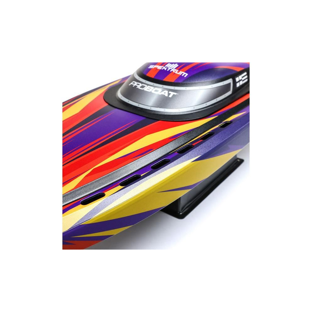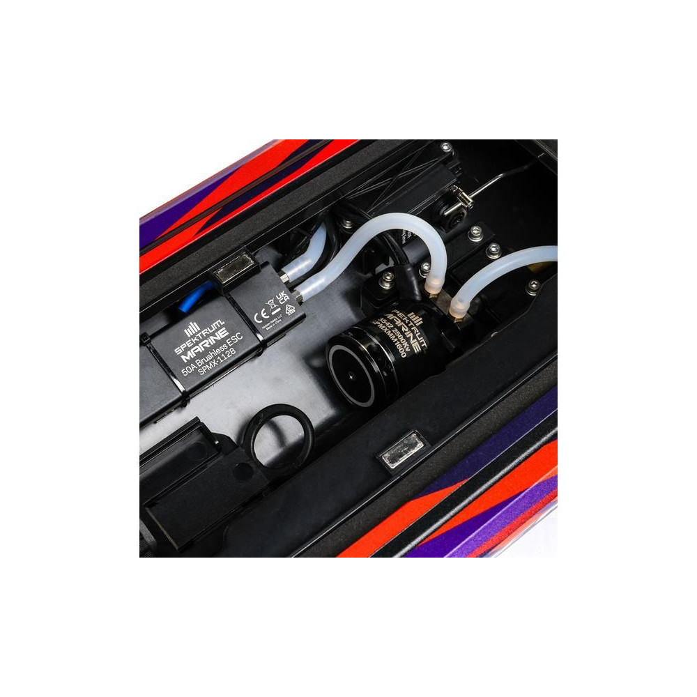 A modell lelke egy vízhűtéses, nagy teljesítményű, 3542 típusú váltóáramú motor, 2500Kv típusú külső futómű és Spektrum 50A Marine szabályozó. Az elegáns, aerodinamikus, V-alakú hajótest könnyedén halad át a hullámokon, és tartós ABS anyagból készült. A hajótest része egy elárasztó kamra, amely néhány másodpercen belül megtelik vízzel, amikor a modellt megfordítják, így automatikusan forog (önkiegyenesítő funkció), és gyorsan visszatérhet az akcióba. Ha vezetés közben sziklának vagy a fenéknek ütközik, a kormánylapát a törés helyett visszahajlik. Csak nyomja vissza a helyére és húzza meg. Az akkumulátor cseréje is egyszerű, amely tépőzárral rögzíthető az SSL (pánt, csúsztatható, zárható) csúszó tartóhoz. A mellékelt akkumulátort a mellékelt USB-C töltővel töltheti automatikus vezérléssel. A töltő tápellátásához bármilyen USB-C adaptert használhat (nem része a csomagnak).