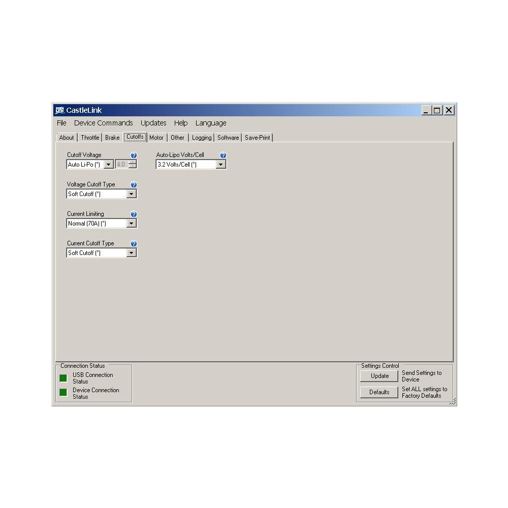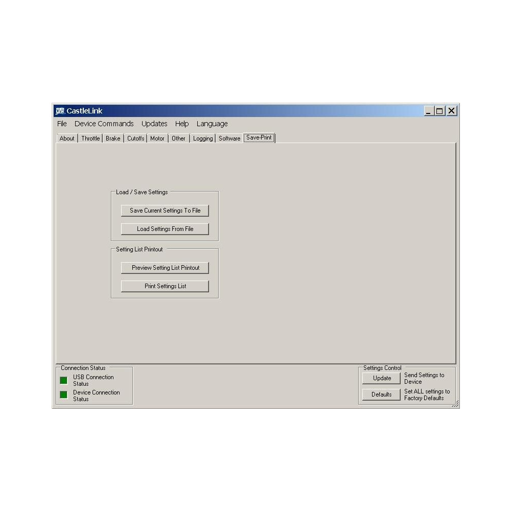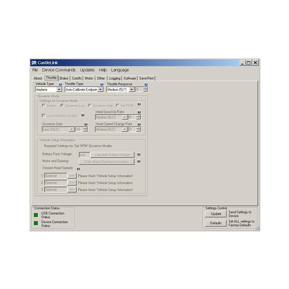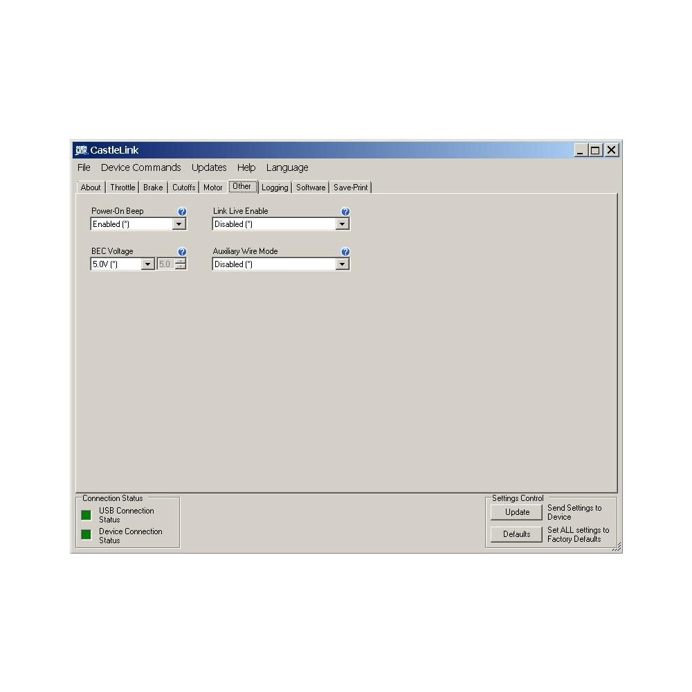 A szabályozó alapvető paraméterei az adó gázkarral vagy a programozókártyával programozhatók. A szabályzó összes paraméterét ezután a Windows számítógépekhez ingyenesen elérhető Castle Link alkalmazással lehet programozni. A vezérlő egy speciális átalakító segítségével csatlakozik a számítógéphez az USB-porton keresztül. Az USB átalakító könnyebb csatlakoztatása érdekében javasoljuk a Quick Connect programozókábel megvásárlását.