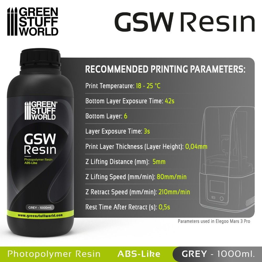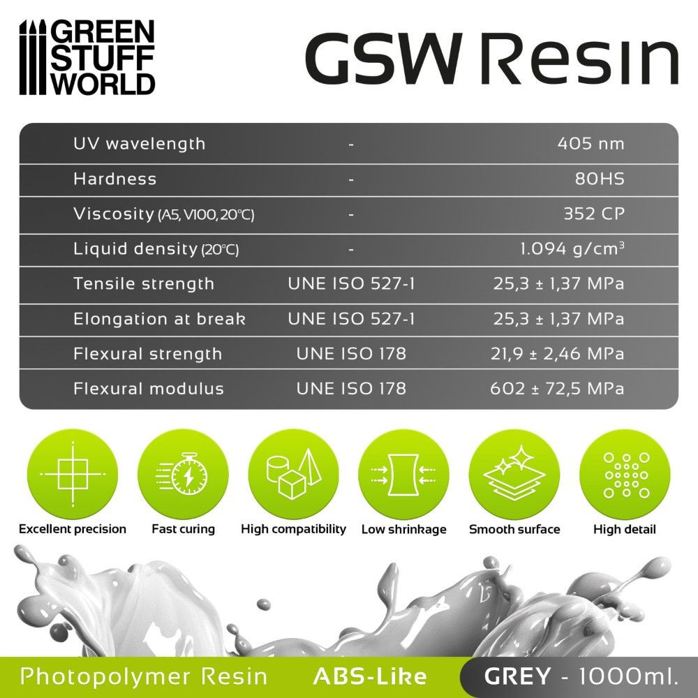 A Green Stuff World 3D nyomtatókhoz való, ABS-szerű szürke gyanta 1000 ml-es kiszerelésben egy prémium fotopolimer, amelyet UV LCD és DLP nyomtatókhoz terveztek. Az ABS műanyag tulajdonságait utánzó összetételének köszönhetően kivételes szilárdságot, részletgazdagságot és mérsékelt rugalmasságot kínál, ami növeli a modellek törésállóságát. Ideális választás társasjátékok, mellszobrok és mechanikus alkatrészek miniatúráinak nyomtatásához, ahol az esztétika és a magas funkcionalitás kombinációja szükséges.