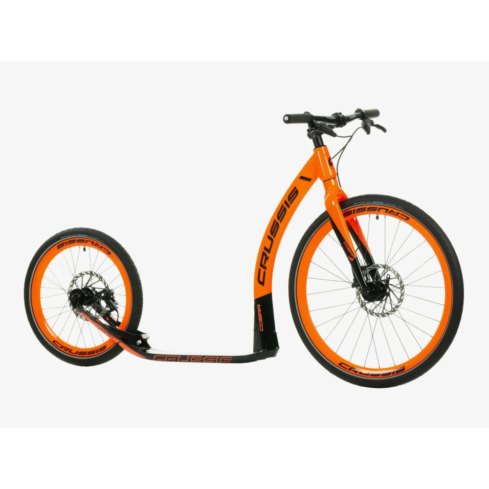Alumínium robogó COBRA Sport a CRUSSIS-tól a csúcs SRAM hidraulikus tárcsafékekkel, 26"×20" átmérőjű kerekekkel és 8,650 kg tömeggel. A robogó ideális a dombosabb terepen akciózók számára, jelentősen jobb fékteljesítménnyel.
