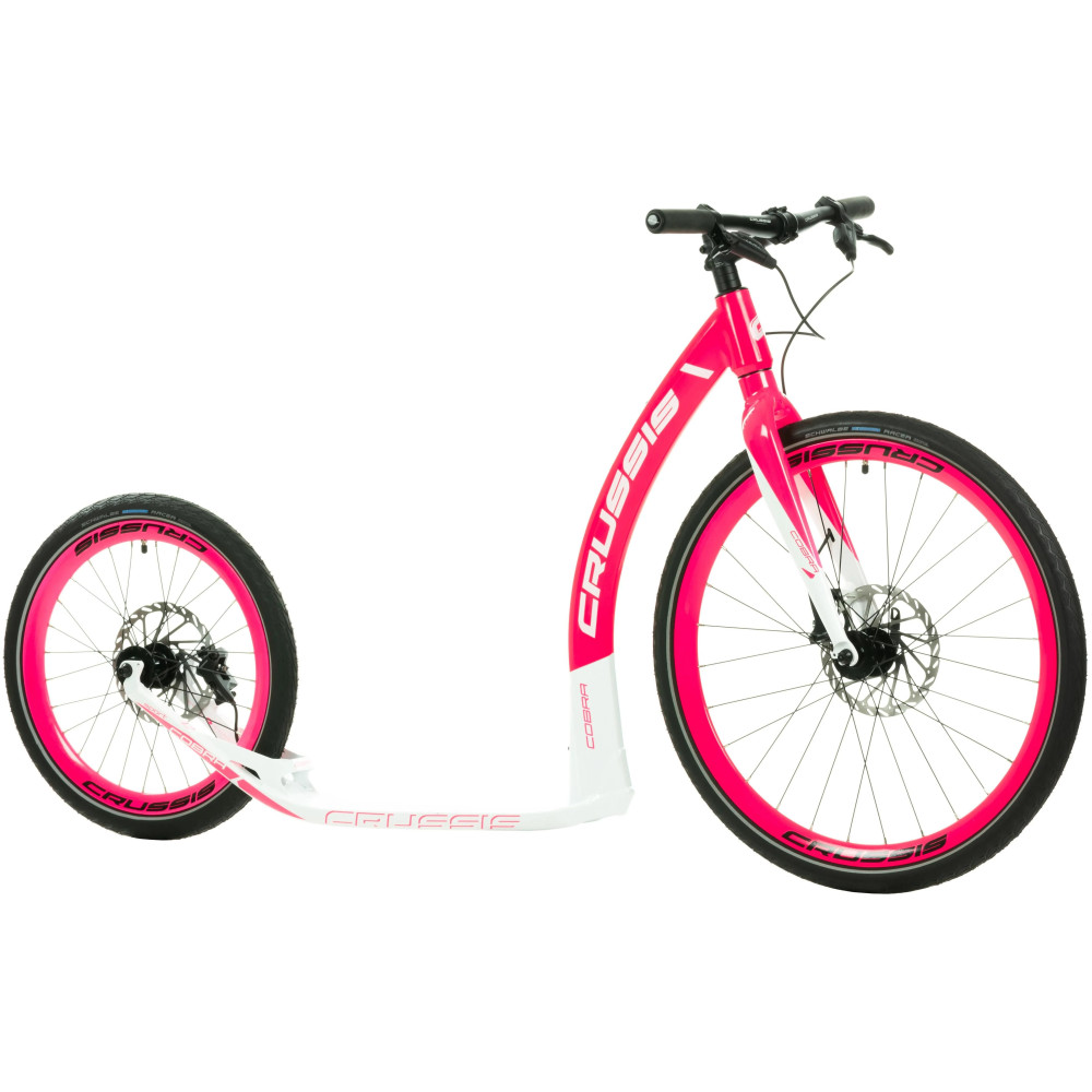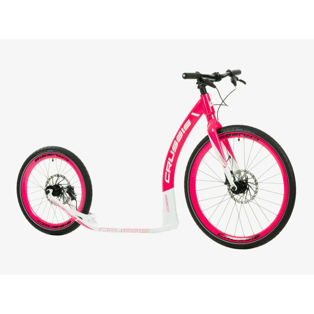 Alumínium robogó COBRA Sport a CRUSSIS-tól a csúcs SRAM hidraulikus tárcsafékekkel, 26"×20" átmérőjű kerekekkel és 8,650 kg tömeggel. A robogó ideális a dombosabb terepen akciózók számára, jelentősen jobb fékteljesítménnyel.