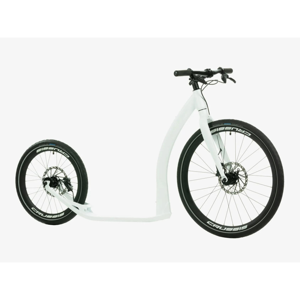 Alumínium robogó egyszínű ONE COBRA Sport by CRUSSIS a csúcs SRAM hidraulikus tárcsafékekkel, 26"×20" átmérőjű kerekekkel és 8,650 kg tömeggel. A robogó ideális az akciómotorosok számára dombosabb terepen, a robogó jelentősen jobb fékteljesítménnyel rendelkezik.