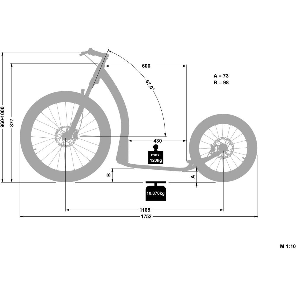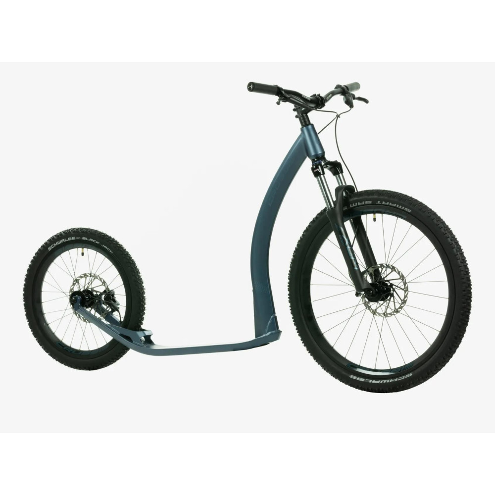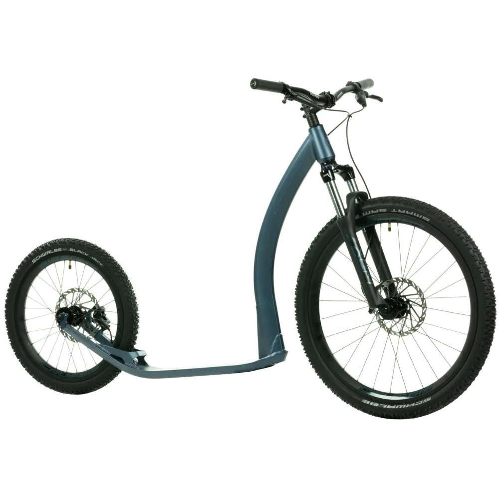 Alumínium terepjáró CROSS 6.2 robogó csúcsminőségű SRAM hidraulikus tárcsafékekkel, 26"×20" kerékátmérővel, 10,870 kg tömeggel, SUNTOUR rugós villával és SCHWALBE MTB gumiabroncsokkal. A robogó ideális a kihívást jelentő terepeken való downhill vagy akció motorozáshoz a kutyával.