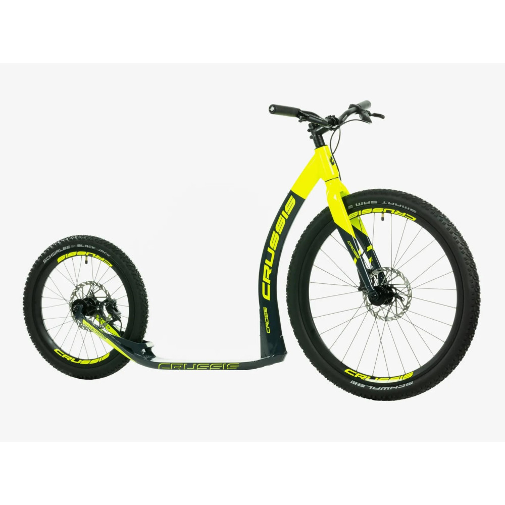 Alumínium off-road robogó CROSS Hard 6.2 a csúcs SRAM hidraulikus tárcsafékekkel, 27,5"×20" kerékátmérővel, 9,080 kg tömeggel, fix villával és SCHWALBE MTB abroncsokkal. A robogó ideális terepjáráshoz és aszfaltozott utakon való közlekedésre egyaránt.