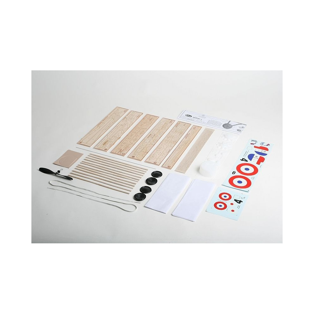 Akészlet a következőket tartalmazza: balsa lézervágott alkatrészek, balsa gerendák, előre kivágott műanyag rétegelt lemez alkatrészek, vákuumpréselt makett alkatrészek (motorborítás, makett motor, gépágyú...), műanyag légcsavar tengellyel és fejjel, gumicsomag (5x1mm gumi), műanyag kerekek, acélzsinór a futóműhöz és egyéb apró alkatrészekhez, műanyag kerekek, bevonópapír, ív nedves matricák, építési terv.