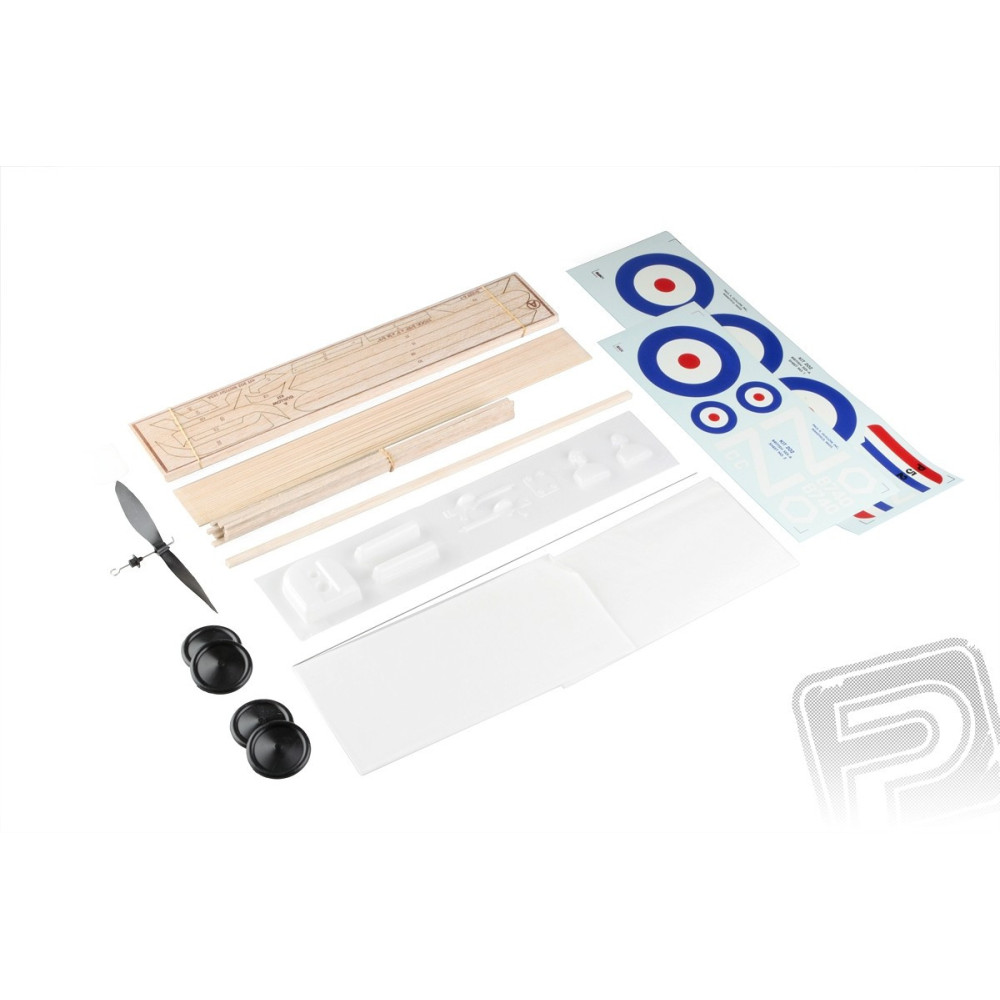 Akészlet a következőket tartalmazza: balsa lézervágott alkatrészek, balsa gerendák, vákuum-öntött makett alkatrészek (kipufogó, géppuska...), műanyag légcsavar tengellyel és fejjel, gumiköteg (5x1mm gumi), műanyag kerekek, acélzsinór a futóműhöz és egyéb apró alkatrészekhez, műanyag kerekek, bevonópapír, ív nedves matricák, építési terv.