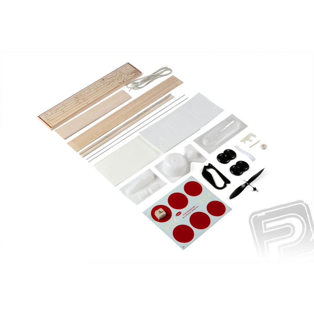 Akészlet tartalma: balsa lézervágott alkatrészek, balsa gerendák, vákuumformázott makett alkatrészek (motorborítás, pilótafülke...), műanyag légcsavar tengellyel és fejjel, gumicsomag (5x1mm gumi), műanyag kerekek, acélzsinór a futóműhöz és egyéb apró alkatrészekhez, műanyag kerekek, borító papír, ív nedves matricák, építési terv.