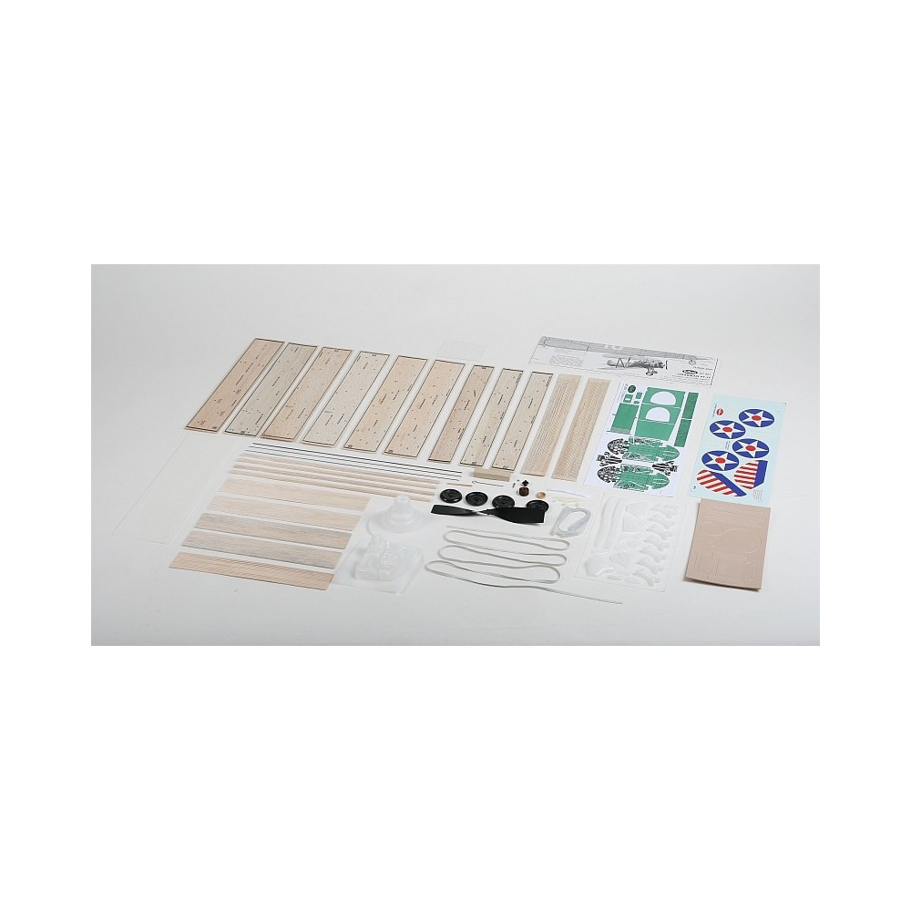Akészlet tartalmazza: balsa előre vágott alkatrészek, balsa gerendák, műanyag rétegelt lemezből készült előre vágott alkatrészek, vákuumpréselt makett alkatrészek (motorburkolat, motor...), műanyag légcsavar tengellyel és fejjel, gumicsomag (5x1mm gumi), acélzsinór a futóműhöz és egyéb apró alkatrészekhez, műanyag kerekek, bevonópapír, fogantyú és lengőkar a befogó modellhez, ív nedves matricák, építési terv.