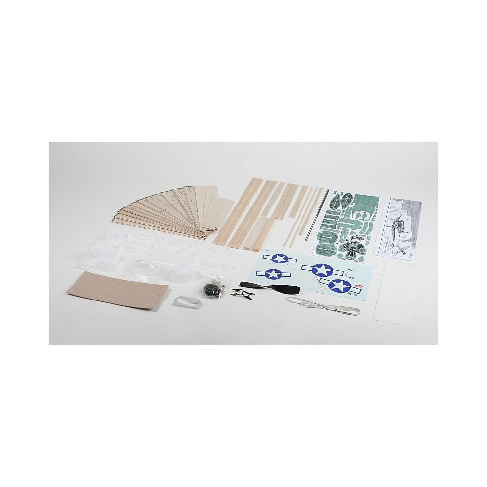 Akészlet tartalmaz: balsa előre kivágott alkatrészeket, balsa gerendákat, műanyag rétegelt lemez előre kivágott alkatrészeket, vákuumformázott makett alkatrészeket (motorburkolat, motor...), átlátszó acetátból öntött pilótafülke burkolat, műanyag légcsavar tengellyel és fejjel, gumicsomó (5x1mm gumi), acélzsinór a futóműhöz és egyéb apró alkatrészekhez, műanyag kerekek, bevonópapír, fogantyú és lengőkar a befogó modellhez, nagy ív nedves matricák, építési terv.