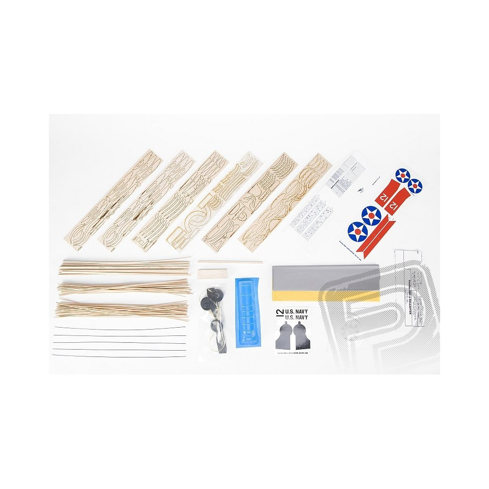 Akészlet tartalma: balsa lézervágott alkatrészek, balsa gerendák, vákuum-öntött alkatrészek (motorborítás, pilótafülke borítás...), műanyag légcsavar tengellyel és fejjel, gumiköteg (FAI TAN II verseny gumi), kerekek, acélzsinór a futóműhöz és egyéb apró alkatrészekhez, színes borító papír, matrica lap, építési terv.