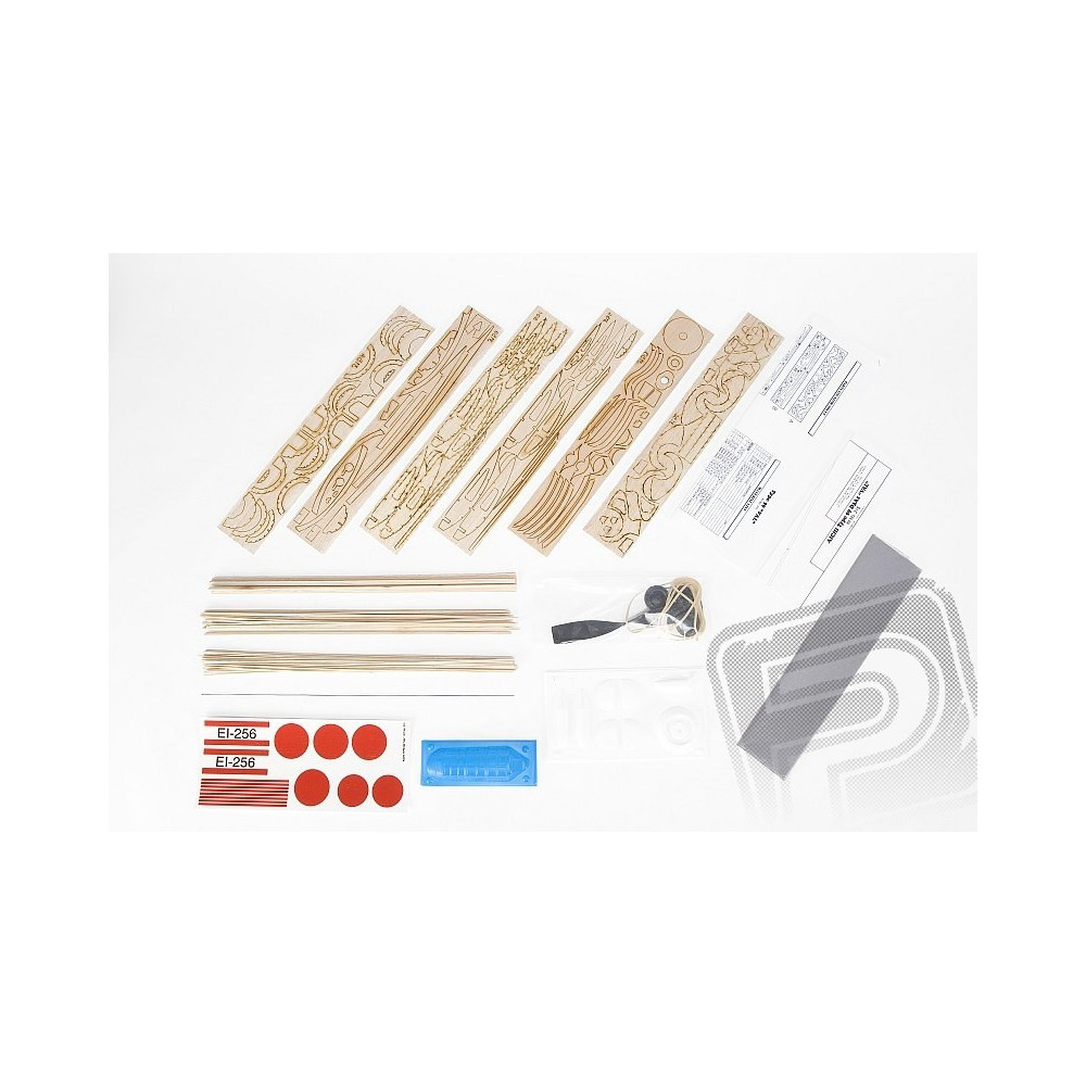 Akészlet tartalmazza: balsa lézervágott alkatrészek, balsa gerendák, vákuum öntött alkatrészek (motorborítás, pilótafülke borítás...), műanyag légcsavar tengellyel és fejjel, gumiköteg (FAI TAN II verseny gumi), kerekek, acél zsinór a futóműhöz és egyéb apró alkatrészekhez, színes borító papír, matrica lap, építési terv.
