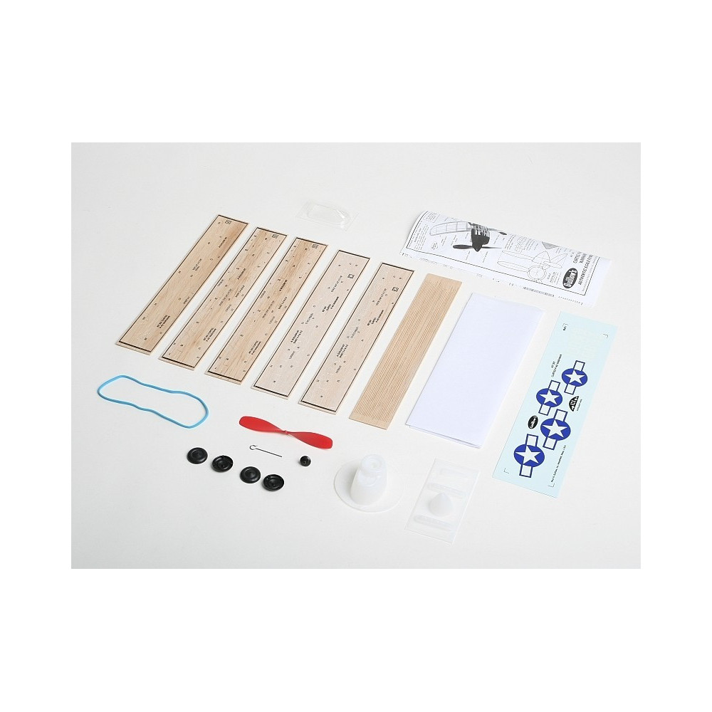 A készlet tartalmaz: előrevágott balsafa alkatrészek, balsafa ”gerendák”, vákuum-formázott alkatrészek (motor-, kabin- burkolat...), műanyag légcsavar tengellyel, gumi köteg, kerekek, acél húr az alvázra és egyéb apró alkatrészek készítésére, bevonó papír, lap matrica, építési terv.