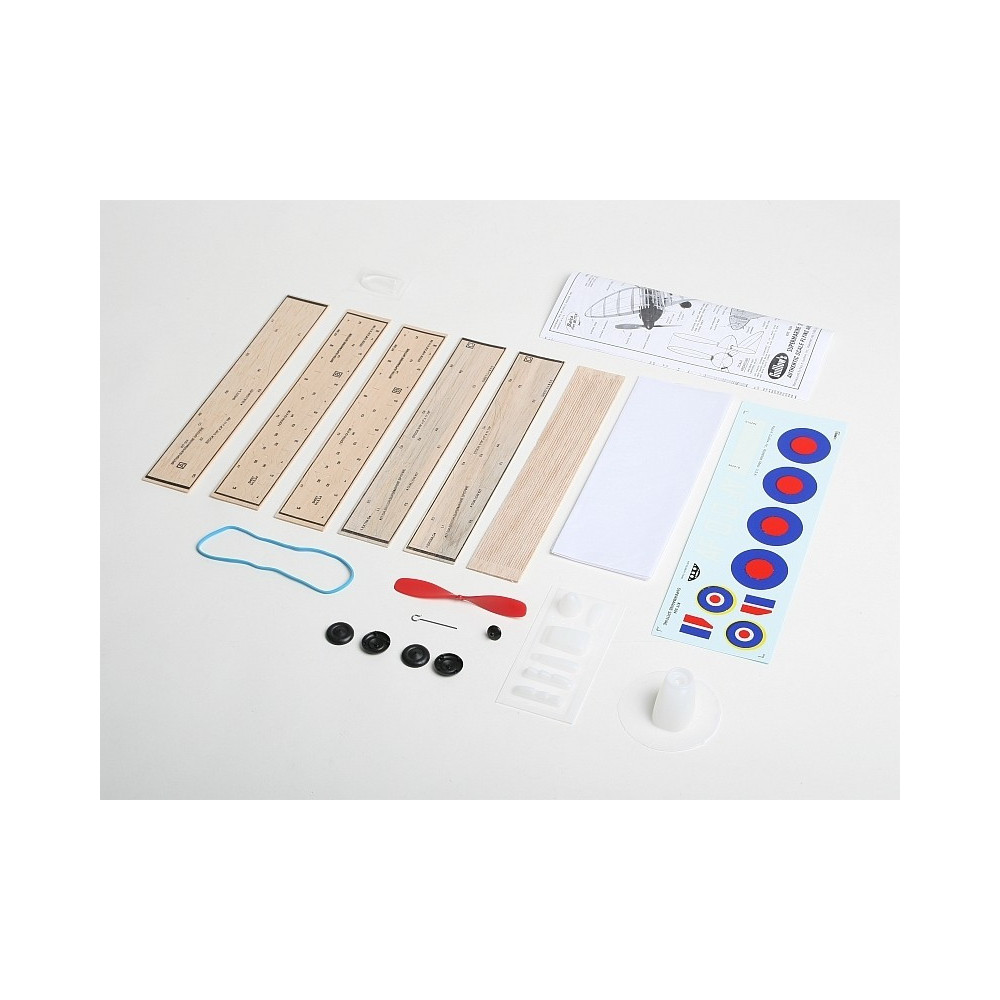 Az építőkészlet tartalmaz: előrevágott balsafa alkatrészek, balsafa ”gerendák”, vákuum-formázott alkatrészek (motor-, kabin- burkolat...), műanyag légcsavar tengellyel és fejjel, gumi köteg, kerekek, acél húr az alvázra és egyéb apró alkatrészek, bevonó papír, lap matrica, építési terv.