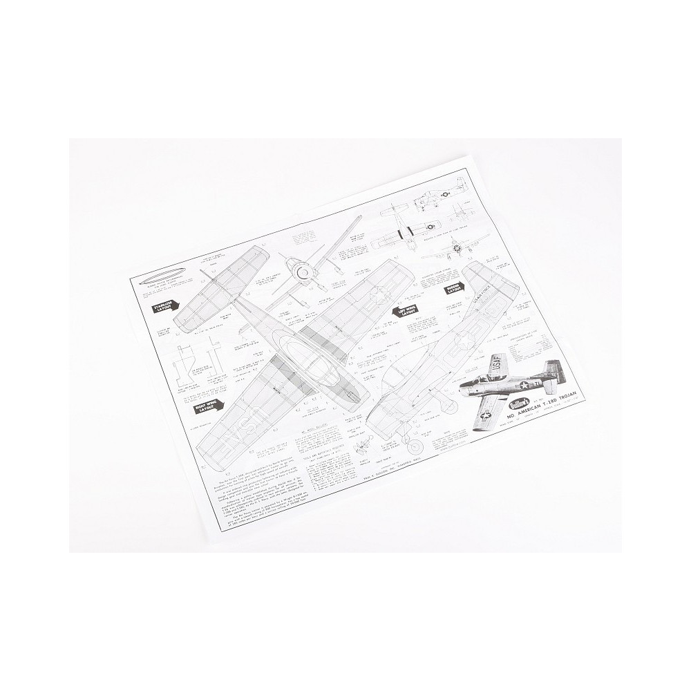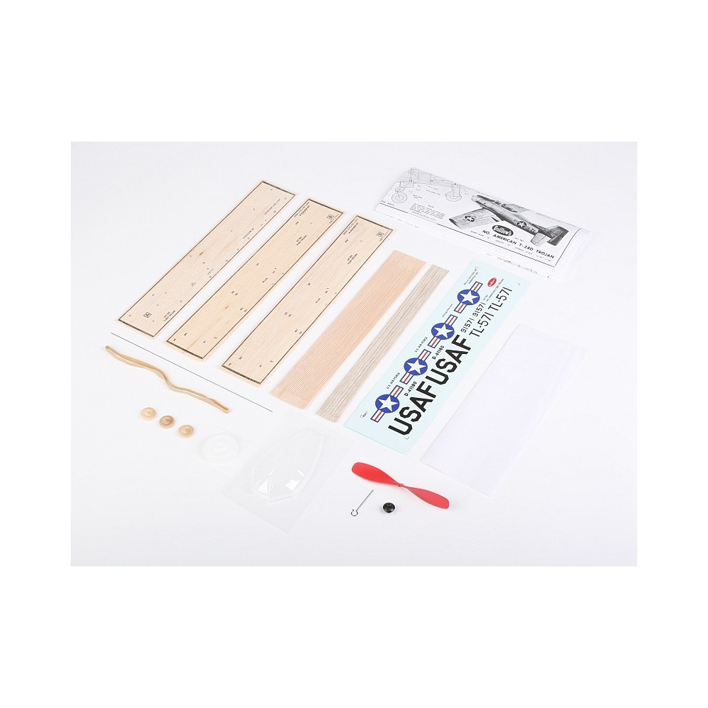 Szabadon repülő amerikai kiképző repülőgép félmakett építőkészlet gumihajtással. Egészségében a modell egy egyszerű klasszikus darabos balsafa szerkezet - előrevágott faalkatrészek, makett tartozékok vákuumformázási műanyagból készített makett tartozékok és fröccsentéssel alakított műanyag alkatrészek.