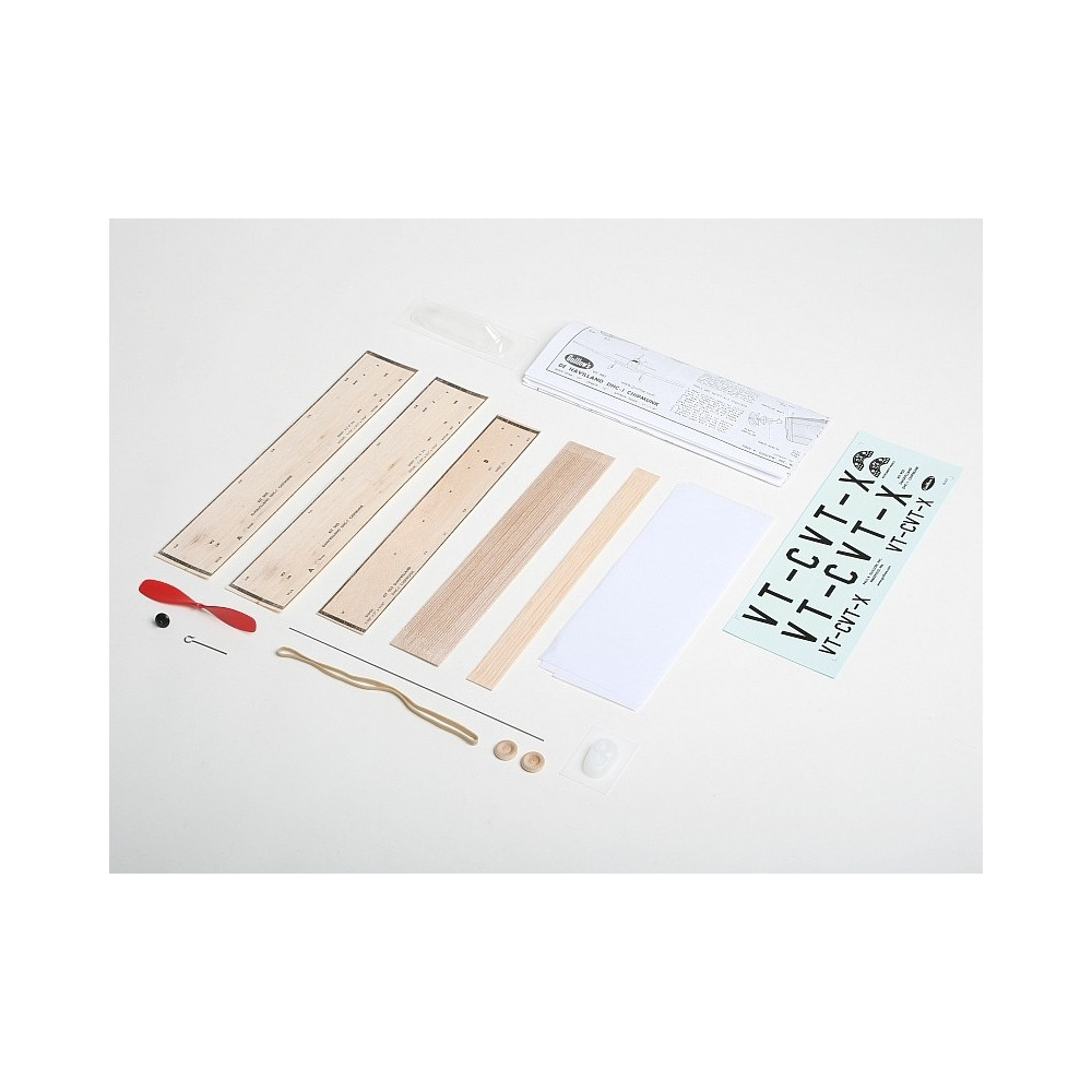 Akészlet tartalma: balsából előre kivágott alkatrészek, balsából készült gerendák, vákuum-öntött alkatrészek (motorborítás, pilótafülke borítása), műanyag légcsavar tengellyel és fejjel, gumiburkolat, balsából készült, kilyuggatott kerekek, acélzsinór a futóműhöz és egyéb apró alkatrészekhez, bevonópapír, ív nedves matricák, építési terv.