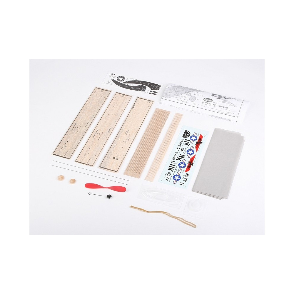 Az építőkészlet tartalmaz: előrevágott balsafa alkatrészek, balsafa ”gerendák”, vákuum-formázott alkatrészek (motorburkolat első része kabinburkolat...), műanyag légcsavar tengellyel, gumi köteg, esztergált balsafa kerekek, acél húr az alvázra és egyéb apró alkatrészek, bevonó papír, lap matrica, építési terv.