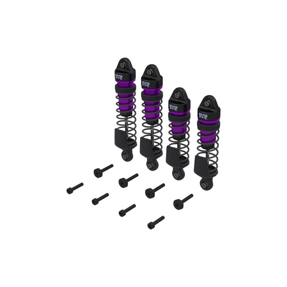 Alkatrész Arrma Mini 1:16 (Mini Kraton) RC autómodellekhez: kipufogódob komplett elöl/hátul lila (4). Tartós alumínium test. Rugó előfeszítő anya. Összeszerelve, rugót és olajat tartalmaz, 700 cSt.