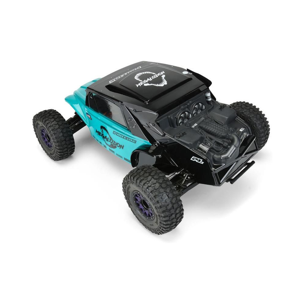 Pro-Line Megalodon Desert Buggy karosszériakészlet. Alakítsa át Slash® 2wd vagy Slash® 4x4 modelljét Megalodon Desert Buggyvá! Ennek a buggynak minden részletét újraalkotják, beleértve a faragott motor részleteket, a tetőbeömlőnyílást, a kiegészítő hátsó sárvédőket és az oldalsó sárvédőket. A lehető legnagyobb Megalodon megalkotásához javasoljuk a Hyrax SCXL 2.2"/3.0" gumiabroncsok használatát a gyilkos túlméretezett megjelenés érdekében. A karosszéria átlátszó, így testre szabhatod a megjelenést, és úgy festheted le, ahogyan csak szeretnéd!