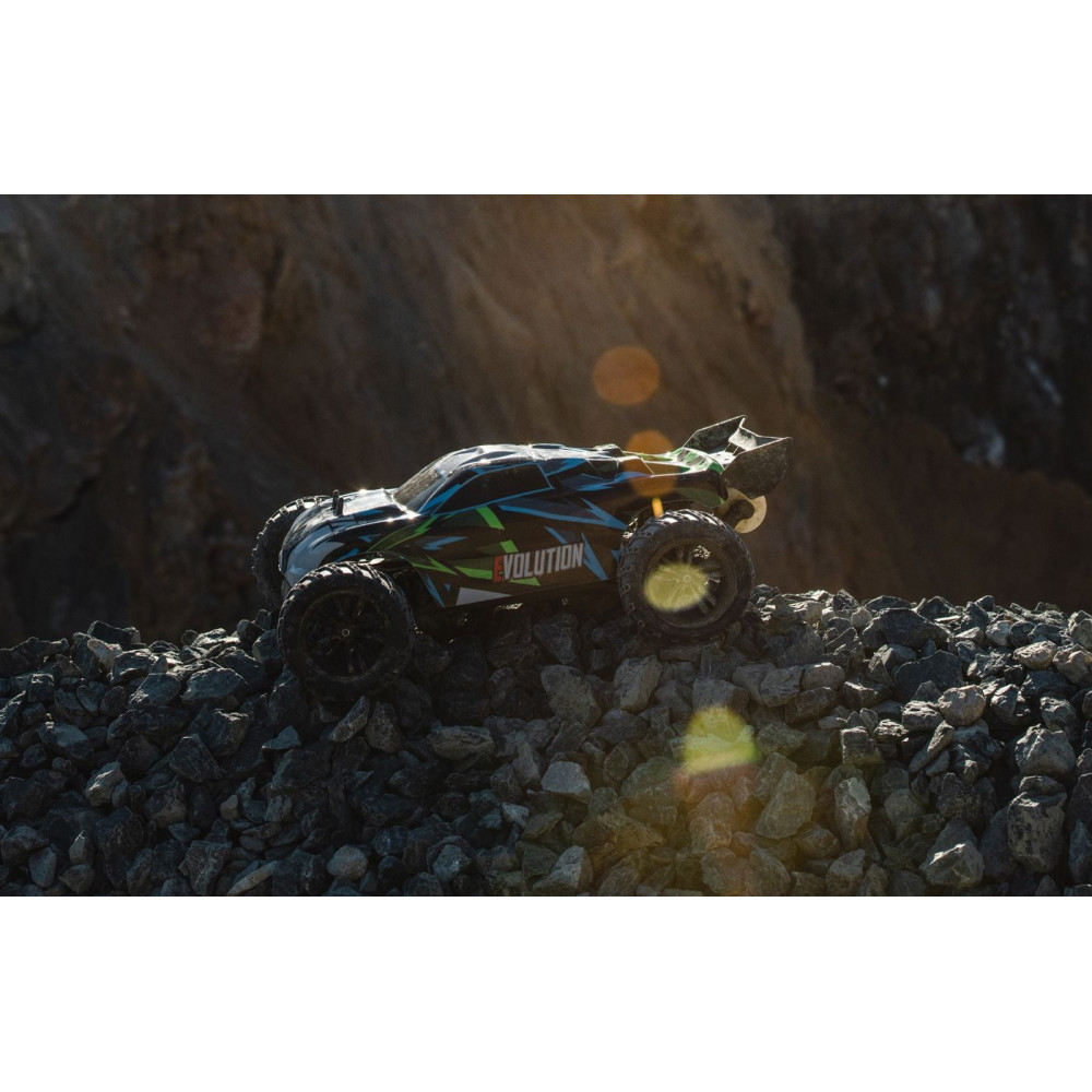 Pod úplne novým predlakovaným náterom MODSTER Evolution žiari pevné odpruženie so 4 vahadlami, stabilný pohon a spoľahlivý systém rádiového riadenia 2,4 GHz. Na prvý pohľad však zaujmú aj pneumatiky MT Wheels s dômyselnými diskami v čiernej farbe.