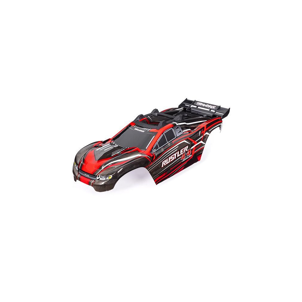 Traxxas test Rustler 4X4 piros. Festett, összeszerelt karosszéria, beleértve a klipszes rögzítőkonzolt és a tető keretet.