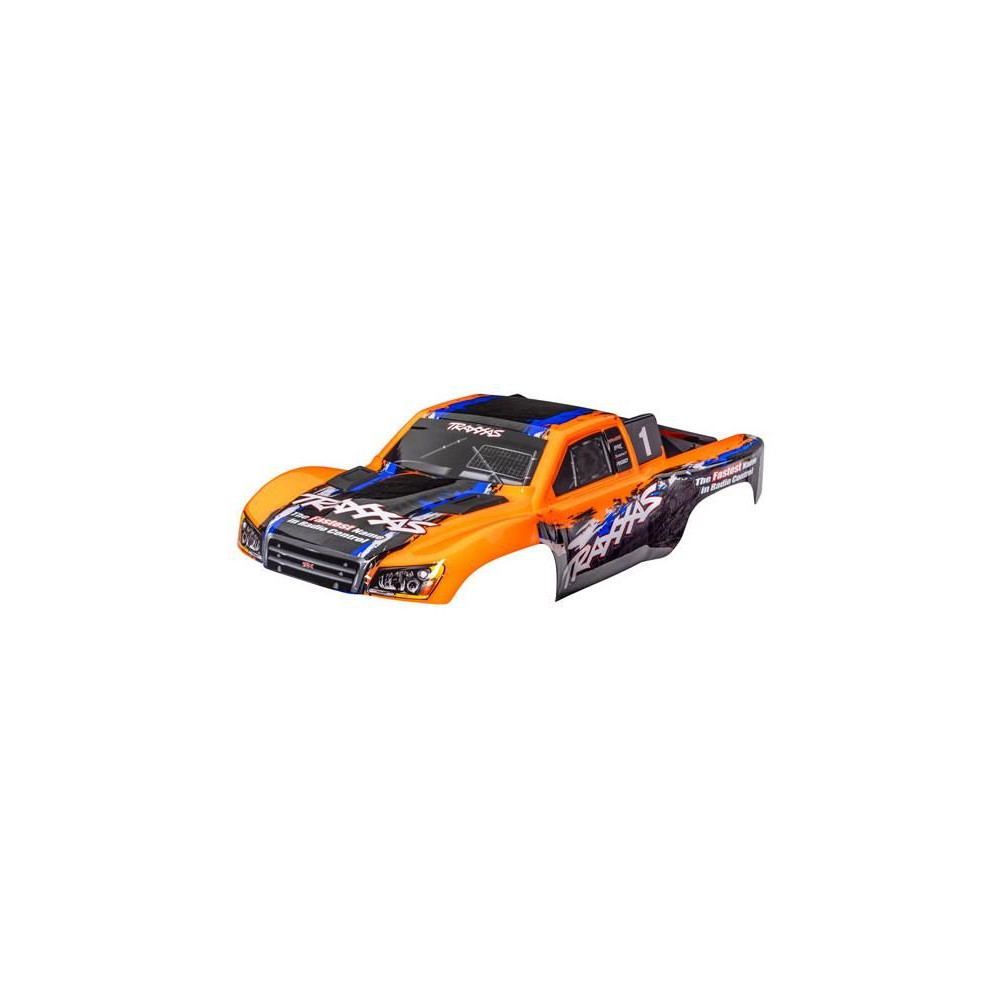 Traxxas Slash 4X4 karosszéria narancssárga. Festett, összeszerelt karosszéria, beleértve a rugó nélküli rögzítő konzolt is. A #6940-es számú alkatrész (Slash 2WD), vagy a #6976-os és #10125-ös számú alkatrészek (Slash 4x4) szükségesek a régebbi Slash alvázakhoz, amelyek a karosszéria kapcsos rögzítési rendszerével rendelkeznek.