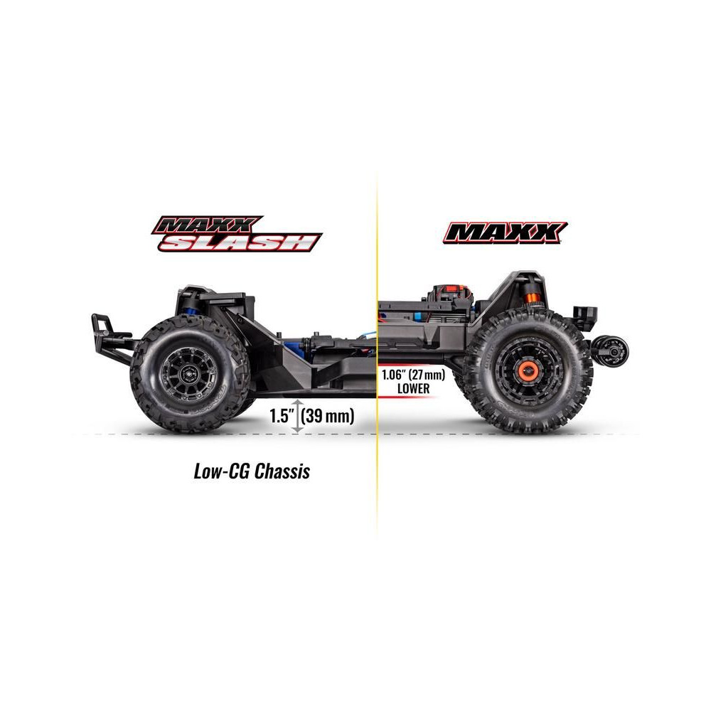 Több mint 15 évvel ezelőtt a Traxxas piacra dobta az 1:10 méretarányú Traxxas Slash RC autómodellt, amely tulajdonságainak köszönhetően évtizedekig a legkelendőbb Short Course modell lett. Most a Slash még nagyobb méretben, 1:8-as méretarányban érkezik, és tele van erővel, tartóssággal és ami a legfontosabb, szórakozással. Az új Maxx Slash a jól bevált Maxx platformra épül, tágas nejlon alvázzal és integrált lengőtornyokkal. Nagyobb méretének, szabad mozgástérének és agresszív futófelületű gumiabroncsainak köszönhetően a modell kompromisszumok nélkül megbirkózik a durva tereppel, akár közúton, akár gördeszkaparkban. A hajtáslánc a legmodernebb alkatrészekkel rendelkezik, beleértve az első, hátsó és középső differenciálműveket fém fogaskerekekkel, a Cush Drive csillapítót és a teljesen új teleszkópos tengelyeket megerősített fém középponttal.