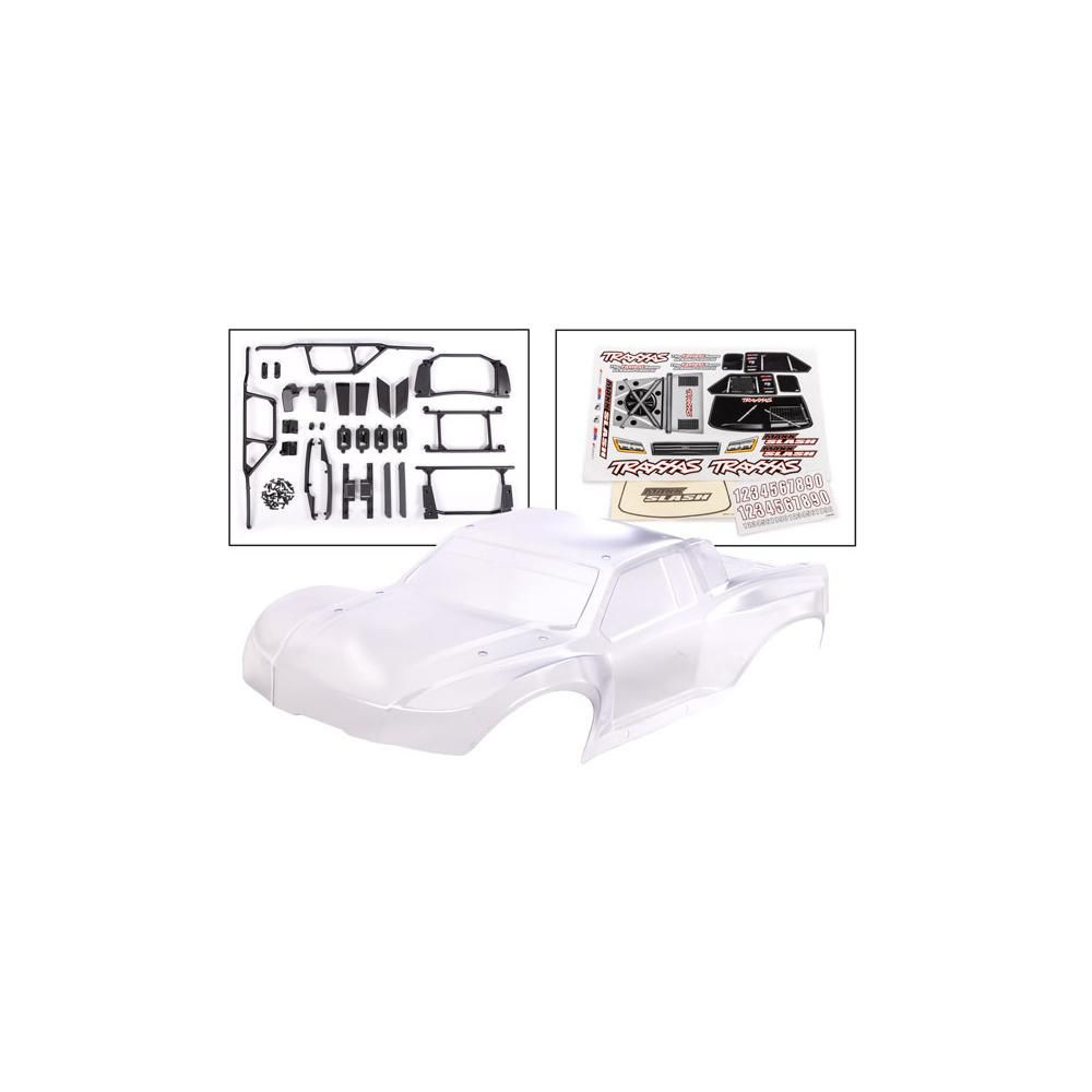 Traxxas Maxx Slash karosszéria tiszta, festést igényel, teljesen le van vágva, spray fóliával felhordva. Tartalmazza a belső keretet, reteszeket, védő műanyag alkatrészeket és ablakmaszkot matricás ívvel.