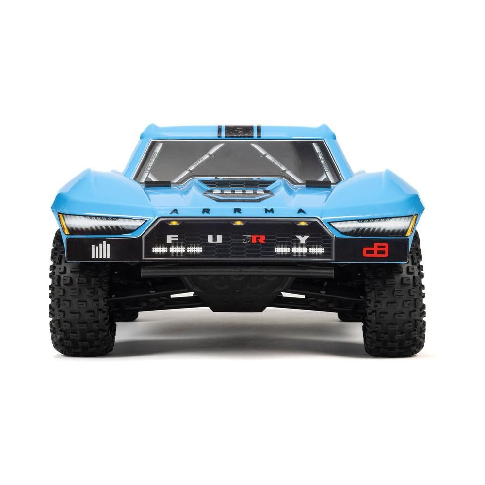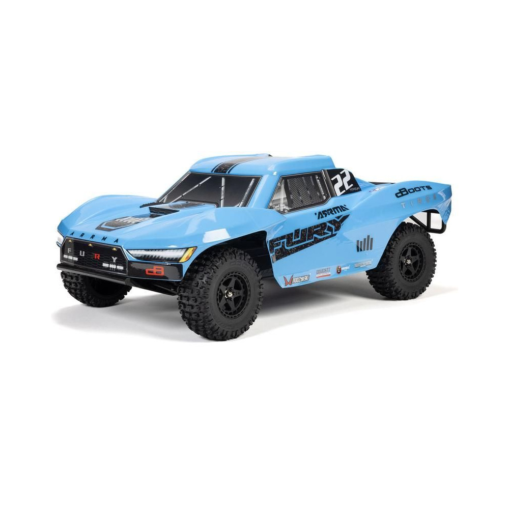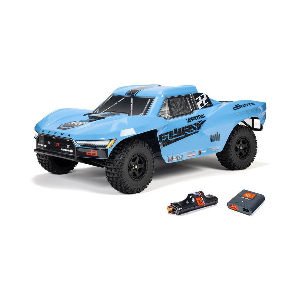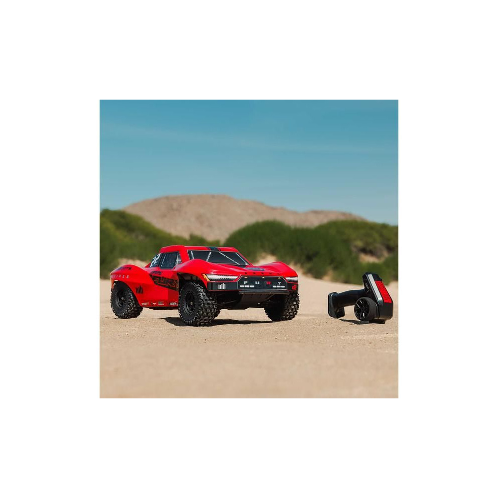 RC modell Arrma Fury Mega 550 1:10 RTR egy megfizethető Short Course távirányítós autó 2WD-vel, független felfüggesztéssel, olajcsillapítókkal, arányos kormányzással és DC motorral. 2,4 GHz SLT RC készlet. NiMH akkumulátor és USB-C töltő tartozék.