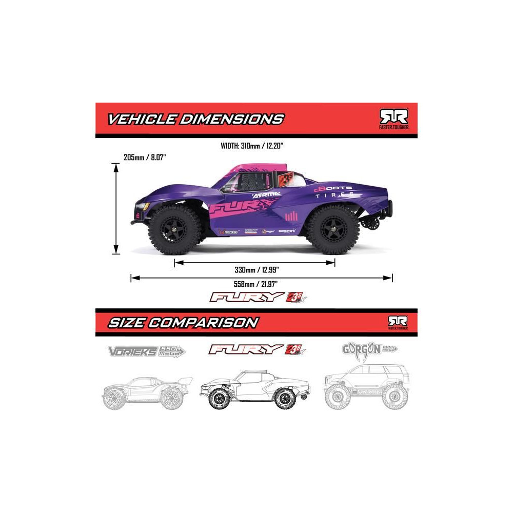 A Fury klasszikus, rövid pályára tervezett autókkal rendelkezik, karosszériával borított kerekekkel és oldalsó Nerf megerősítésekkel, így nem kell aggódnod az esetleges bukkanók miatt. Az alacsony alváz lehetővé teszi a nagy sebességű kanyarvételt. A modell alkalmas kemény felületekre, kavicsra és alacsony fűre. A kompozit váz még a kemény ütéseket is kibírja. A használt fém fogaskerekek kellően tartósak a váltakozó áramú meghajtáshoz. A maximális tapadást a bevált dBoots Fortress SC gumiabroncsok biztosítják. A Spektrum SLT adó biztonságos, meghibásodás nélküli működést biztosít, a gondtalan vezetés érdekében a modell vízálló* alkatrészeket használ - Spektrum 2 az 1-ben 44A-es vevőszabályozót és nagy nyomatékú Spektrum S681 szervovezérlést.